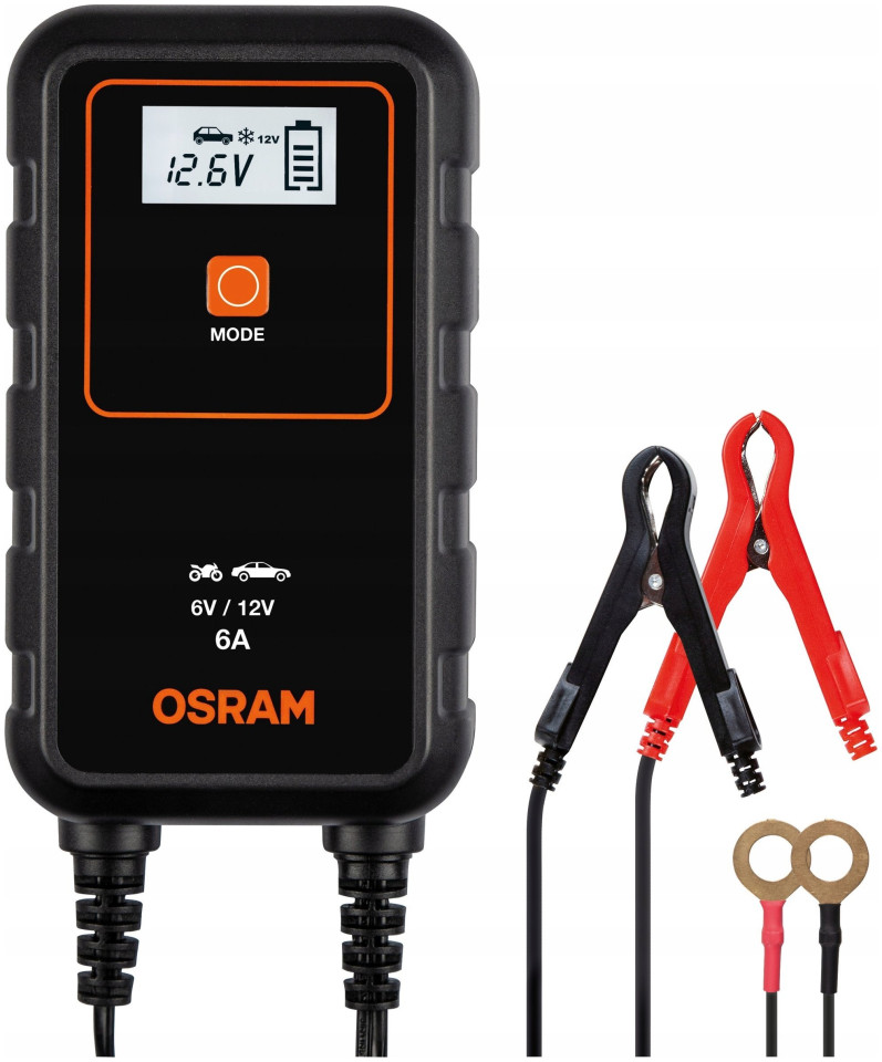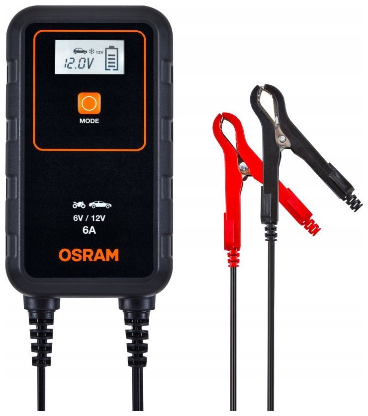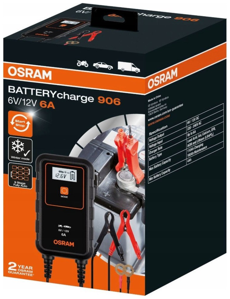 OSRAM BATTERYCHARGE 906 6/12V - Αυτόματος ανορθωτής 6A Osram BATTERYcharge 906 για μπαταρίες μολύβδου-οξέος 6/12V - 6A Ο ανορθωτής προορίζεται για φόρτιση μπαταριών μολύβδου-οξέος/AGM και λιθίου. Σας επιτρέπει να φορτίζετε οχήματα 6V και 12V, συμπεριλαμβανομένων μοτοσυκλετών και επιβατικών αυτοκινήτων. Διαδικασία φόρτισης 9 βημάτων για μπαταρίες μολύβδου-οξέος/AGM, διαδικασία φόρτισης 7 βημάτων για μπαταρίες λιθίου. Συνδέστε την πρίζα και να έχετε το κεφάλι σας ήσυχο καθώς ο φορτιστής μεταβαίνει αυτόματα στη λειτουργία trickle όταν η μπαταρία φορτιστεί πλήρως. Περιλαμβάνει μια ψηφιακή οθόνη που διευκολύνει την προβολή της διαδικασίας φόρτισης και μια σειρά από ασφάλειες, συμπεριλαμβανομένης της αντίστροφης πολικότητας και της υπέρτασης. Πλεονεκτήματα του ανορθωτή: Έλεγχος μικροεπεξεργαστή, Σταθερή λειτουργία φόρτισης, Διάγνωση και φόρτιση πολύ αποφορτισμένων μπαταριών, Μονωμένοι ακροδέκτες, τα λεγόμενα Κλιπ Crocodile Τεχνικά δεδομένα: τάση τροφοδοσίας - 220-230V ονομαστική τάση εξόδου - 6 ή 12V μέγιστο ρεύμα φόρτισης: 6A προστασία από τυχαίο βραχυκύκλωμα Προστασία έναντι λανθασμένης σύνδεσης ακροδεκτών Θερμική προστασία Οθόνη LCD