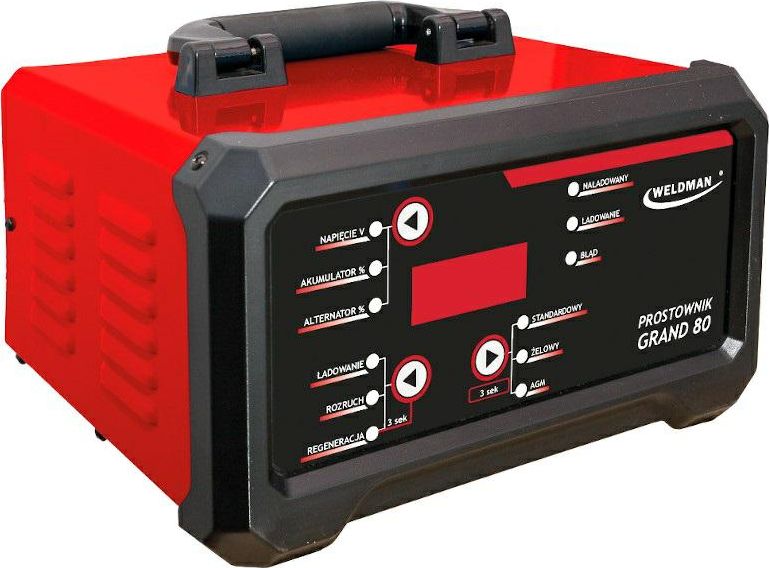 Οι έξυπνοι ανορθωτές μικροεπεξεργαστή GRAND 80 είναι σχεδιασμένοι για φόρτιση και εκκίνηση όλων των τύπων μπαταριών μολύβδου (WET/MF/CA/EFB/GEL/AGM). ) η λειτουργία εκκίνησης είναι αυτόματη, η οποία προστατεύει τη συσκευή από υπερθέρμανση και ζημιά - GRAND 80 Τάση τροφοδοσίας - 230V Κατανάλωση ρεύματος φόρτιση/εκκίνηση (kW) - 0,8 /3 Τάση ρεύματος (V) - 12/24 Ονομαστικό ρεύμα φόρτισης (A) - 12V: 5/10/20, 24V, 5/10/20 Ονομαστικό ρεύμα εκκίνησης - 12/24 80 AΒάρος - 10 kg Περιλαμβάνεται: Καλώδιο ρεύματος 1,8 m με βύσμα 230V Καλώδιο 1,2 m με κόκκινο σφιγκτήρα (+) Καλώδιο 1,2 m με μαύρο σφιγκτήρα (-){Βάρος [kg]} 10 . {Τάση φόρτισης} 12/24V