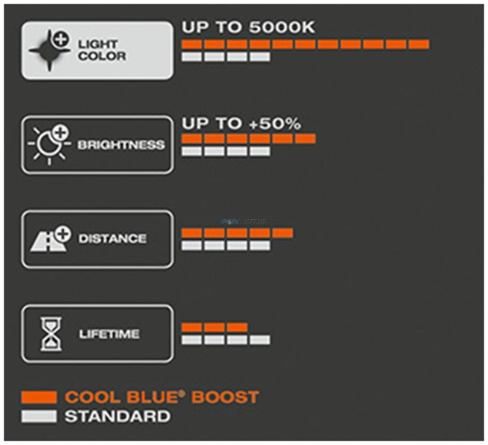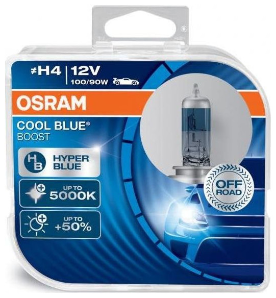COOL BLUE BOOST zapewnia niezwykle niebieskie halogenowe światło o temperaturze barwowej do 5000 K. Źródła generują do 50% więcej światła w porównaniu do źródeł halogenowych pokrytych niebieskim filtrem.Model: H4Ilość sztuk: 2Technologia: halogenMoc: 80/80WTrzonek: P43tNapięcie: 12VStrumień świetlny: 1100 lm ±15%Trwałość B3: 150hTrwałość Tc: 350h