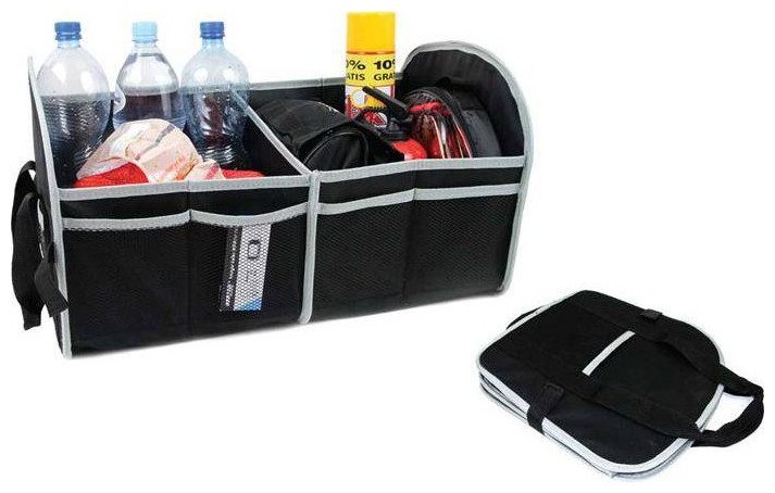 Cechy produktu: Praktyczny organizer-torba z wieloma różnej wielkości przegródkami. Możesz do niego włożyć wiele podręcznych przedmiotów np zabawki dziecka. Bardzo przydatny do przewożenia akcesorii dla dzieci lub kosmetyków samochodowych. Dzięki temu organizerowi będziesz miał wszystkie potrzebne rzeczy pod ręką a nie rozrzucone w bałaganie po całym aucie. Co ważne - przy gwałtownych hamowaniach wszystkie przedmioty umieszczone w organizerze zostaną na swoim miejscu. Można go umiejscowić w bagażniku lub na tylnych siedzeniach samochodu. Pomaga utrzymać porządek we wnętrzu samochodu. Jest bardzo trwały i łatwy w czyszczeniu - wystarczy przetrzeć wilgotną szmatką lub umyć pod bieżącą wodą. Bardzo pojemny - zmieszcisz w nim wiele rzeczy, Posiada aż 9 kieszeni o różnej pojemności. Organizer można złożyć by zajmował mniej miejsca. W razie konieczności można rozłożyć tylko połówkę organizera dzięki wbudowanym zatrzaskom. Kolor: czarny