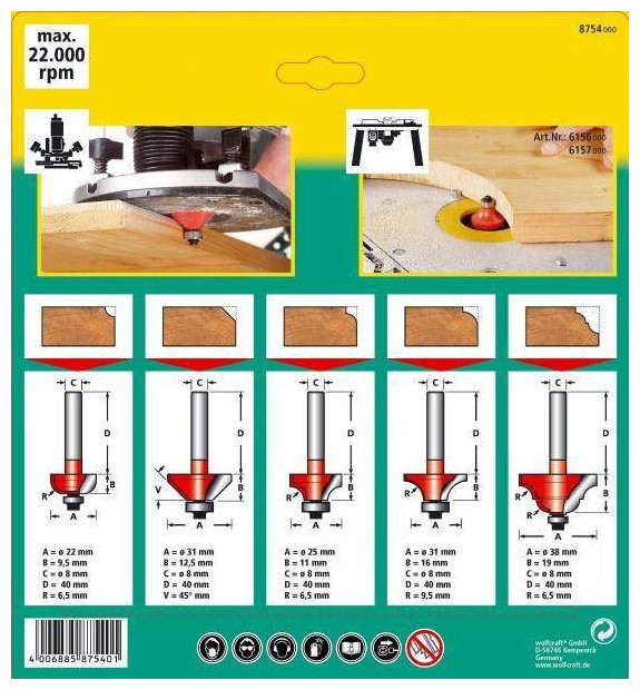 - συσκευή: δρομολογητές - για την κατασκευή στρογγυλών προφίλ - κόφτης προφίλ με ρουλεμάν - το εκτεταμένο στέλεχος εξασφαλίζει καθολική χρήση τόσο για χειροκίνητο όσο και για σταθερό φρεζάρισμα - υλικό: HM - μήκος κορμού 40 mm - διάμετρος στελέχους: ø 8 mm - μέγ. 22.000 RPM - σε: κουτί 2 συστατικών, αναδιπλούμενο, 1 x ακτίνα κοπής - ημικυρτό ø 22 mm, ύψος κοπής 9,5 mm, r 6,51 x λοξότμηση ø 31 mm, ύψος κοπής 12,5 mm, γωνία 45 °, r 6,51 x κόφτης ακτίνας ø 25 mm, ύψος κοπής 11 mm, r 6,51 x κόφτης ακτίνας ø 31 mm, ύψος κοπής 16 mm, r 9,51 x κόφτης προφίλ ø 38 mm, ύψος κοπής 19 mm, r 6 ,5 καινοτόμα εργαλεία WOLFCRAFT για φιλόδοξα εργαλεία DIY DIY Η εταιρεία ιδρύθηκε το 1949 και έκτοτε είναι ένας αναγνωρισμένος κατασκευαστής καινοτόμων εργαλείων χειρός και αξεσουάρ γενικής χρήσης για ηλεκτρικά εργαλεία που προορίζονται για χρήση τόσο σε νοικοκυριά όσο και από απαιτητικούς χρήστες. Είμαστε μια εταιρεία που επικεντρώνεται στη συνεχή ανάπτυξη με στόχο την κάλυψη των αναγκών και των συμφερόντων των Συνεργατών και των Πελατών μας. Εφαρμόζουμε τη φιλοσοφία παραγωγής και πωλήσεων για πάνω από 60 χρόνια, εισάγοντας με επιτυχία νέες και καινοτόμες λύσεις στην αγορά.{Type} Σετ φρέζας . {Type} Σετ φρέζας . {Type} Σετ φρέζας . {Type} Σετ φρέζας . {Type} Σετ φρέζας