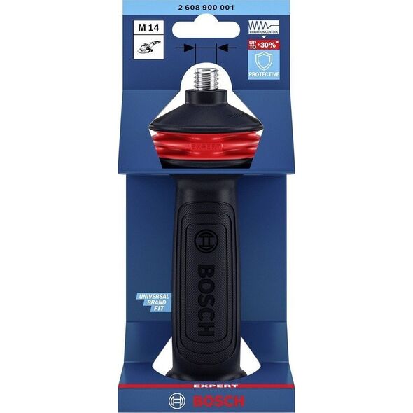 Το Bosch Handle Expert 2608900001 με έλεγχο κραδασμών είναι κατάλληλο για αριστερόχειρες και δεξιόχειρες. Το Bosch Vibration Control είναι ένα ευέλικτο σύστημα απορρόφησης κραδασμών που μειώνει αποτελεσματικά τους κραδασμούς του εργαλείου έως και 30%. Το παχύ λάστιχο παρέχει επιπλέον πρόσφυση και καλύτερο έλεγχο. Το Bosch Handle Expert είναι συμβατό με όλους τους γωνιακούς τροχούς με σπείρωμα M14.