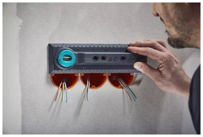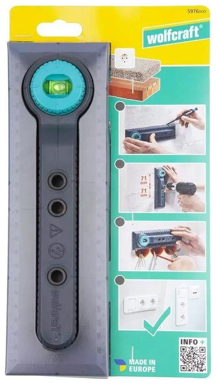 Πρότυπο για σήμανση, τοποθέτηση και διάνοιξη οπών στον τοίχο για ηλεκτρικές πρίζες και διακόπτες - το αλφάδι μπορεί να περιστραφεί υπό γωνία 90° για οριζόντια και κατακόρυφη τοποθέτηση του προτύπου, προκειμένου να επισημανθεί με ακρίβεια η θέση διάτρησης και η θέση των κουτιών εγκατάστασης. και αξεσουάρ - σημάνσεις 71 και 91 mm για εύκολη μεταφορά των σωστών αποστάσεων μεταξύ δύο κουτιών εγκατάστασης, καθώς και μεταξύ ηλεκτρικών πριζών και πριζών τηλεόρασης και δικτύου - εικονογραφημένες οδηγίες που δείχνουν βήμα προς βήμα πώς να χρησιμοποιήσετε σωστά το πρότυπο για ασφαλή και άνετη εγκατάσταση - μέγιστο εύρος μέτρησης: 240 mm