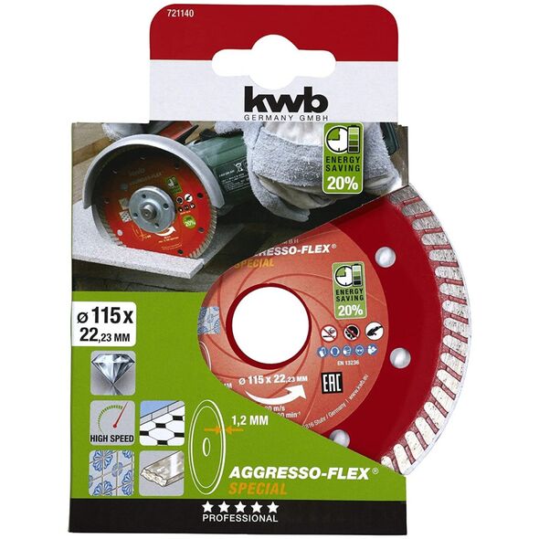 kwb 721140. Μοντέλο: Δίσκος κοπής, Κατάλληλο για υλικά: Πέτρα, Συμβατότητα μάρκας: Οποιαδήποτε μάρκα. Βάρος συμπεριλαμβανομένης της συσκευασίας: 80 g, Βάθος συσκευασίας: 115 mm, Πλάτος συσκευασίας: 155 mm. Ποσότητα ανά συσκευασία: 1 τεμ.