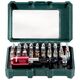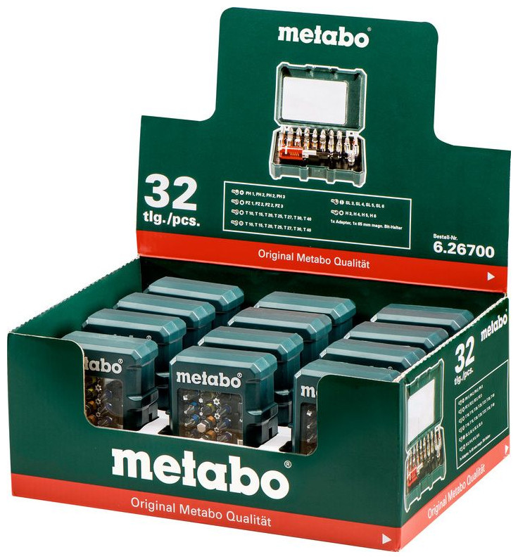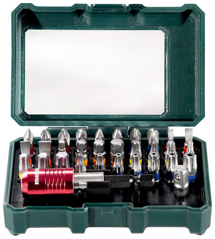 Bity ze stali chromowo-wanadowej (S2) z oznaczeniem barwnym umożliwiającym szybkie i łatwe odnalezienie właściwego bitu; magnetyczny adapter do szybkiej wymiany; adapter do kluczy nasadowych (adapter do końcówek nasadowych); wytrzymałe pudełko wysokiej jakości w specjalnym wzornictwie Metabo