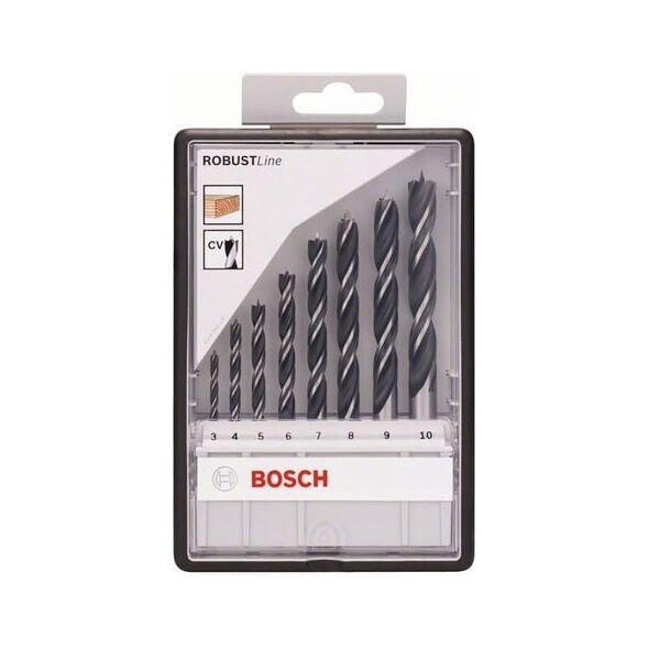 Zestaw wierteł spiralnych do drewna Robust Line 3-10mm 8 elementów (2607010533) 8-częściowy zestaw wierteł spiralnych do drewna Robust Line Średnica mm 3.0 / 4.0 / 5.0 / 6.0 / 7.0 / 8.0 / 9.0 / 10.0 Długość robocza mm 30.0 / 40.0 / 45.0 / 50.0 / 60.0 / 65.0 / 70.0 / 75.0 Wymiary zestawu [mm] 156,5 x 106,5 x 23