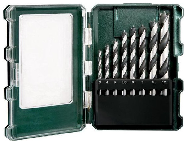 Osiem wierteł, zapakowane w wysokogatunkowej, wytrzymałej kasecie z tworzywa sztucznego w specjalnym wzornictwie Metabo z wysuwaną eurozawieszką.Dane techniczne:8 części,zapakowane w wysokogatunkowej, wytrzymałej kasecie z tworzywa sztucznegowiertła spiralne do drewna ze stali chromowo-wanadowej wysokiej jakościhartowane,z kłem centrującym,do stosowania w drewnie twardym i miękkim, sklejce, płytach wiórowych itp.Wyposażenie podstawowe :Ilość w zestawie: 8 sztuk Średnice wierteł: 3 / 4 / 5 / 5,5 / 6 / 7 / 8 / 10 mmOpakowanie: kaseta metalowa.