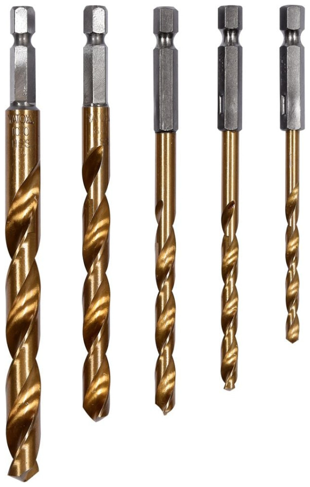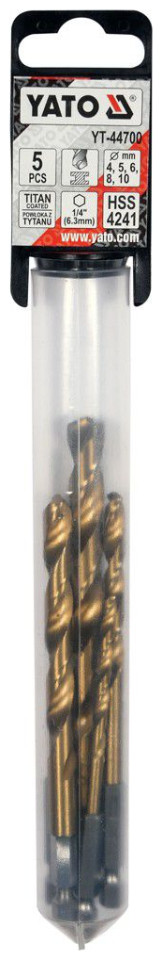 Ένα σετ τρυπανιών με επίστρωση τιτανίου για μέταλλο με εξαγωνική λαβή της YATO YT-44700 Από ατσάλι υψηλής ταχύτητας HSS, επικαλυμμένο με επίστρωση τιτανίου. Το σημείο διαίρεσης επιτρέπει τη διάτρηση χωρίς προηγούμενη χάραξη. Οι άκρες των τρυπανιών είναι αλεσμένες. Γωνία κορυφής 135 μοίρες. Διαχέουν γρήγορα τη θερμότητα κατά τη διάτρηση σε τύπους σκληρού χάλυβα, χωρίς να προκαλούν το κάψιμο των τρυπανιών. Αφιερωμένο σε επαγγελματικές εφαρμογές, διάτρηση σε υψηλής ποιότητας ανοξείδωτο χάλυβα, δομικό χάλυβα και χάλυβα ψυχρής έλασης.