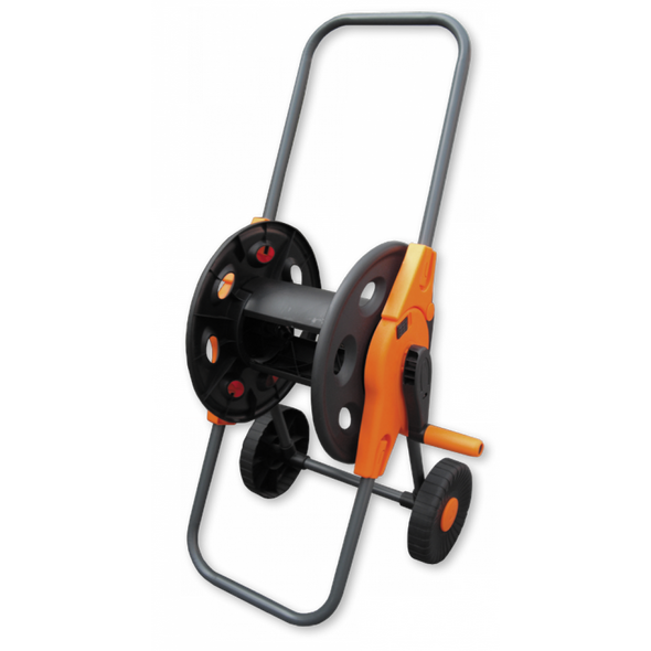 Posiada stabilną i wytrzymałą podstawę. Bęben wykonany jest z mocnego polipropylenowego tworzywa odpornego na promieniowanie UV. Dużym atutem naszych wózków jest długa metalowa rączka, która ułatwia poruszanie się (bez schylania) oraz możliwość składania. Umożliwia to zaoszczędzenie miejsca podczas przechowywania. Metalowe rurki zabezpieczone są powłoką antykorozyjną. Obrotowe podłączenie przyłącza zapobiega skręcaniu się węża podłączeniowego przy rozwijaniu i zwijaniu węża zasadniczego. Wygodna korba. Duże, lekko kręcące się koła ze specjalnym profilem zapobiegającym ślizganiu się. Dostępny w kolorze czarno-pomarańczowym.