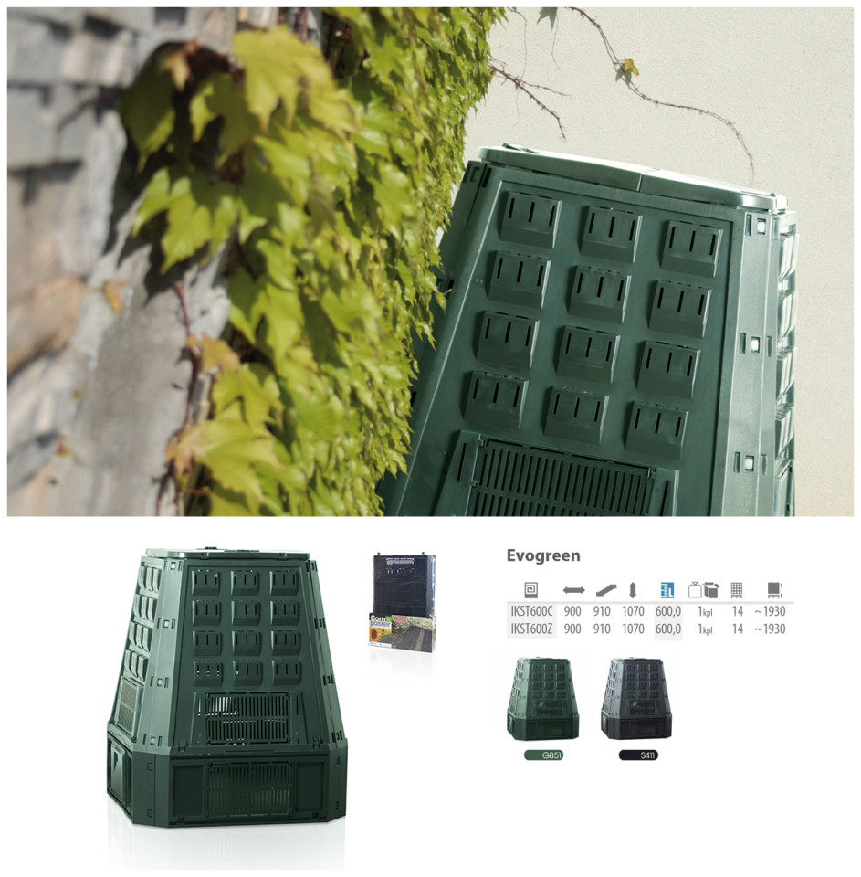 EVOGREEN COMPOSTER 630 L GREEN Διαστάσεις: - χωρητικότητα: 630 l - ύψος: 1070 χιλ. - πλάτος: 900 χιλ συναρμολόγηση, αποτελεσματική, ανθεκτική δομή, αισθητική και φιλική μορφή που αυξάνει τη συμβίωση με το περιβάλλον και αποφέρει πραγματική εξοικονόμηση έως και 80% των οικιακών απορριμμάτων μπορεί να μετατραπεί σε καθαρό λίπασμα.{Χρώμα} Πράσινο. {Χωρητικότητα} 600 l . {Πλάτος} 91 cm. {Μήκος} 90 cm. {Ύψος} 107 cm. {Τύπος} Πλαστικό