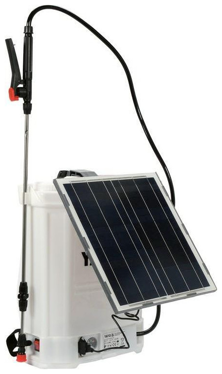 Περιγραφή Ο ψεκαστήρας σακιδίων που λειτουργεί με μπαταρία είναι μια βολική συσκευή σχεδιασμένη για προστατευτικό και αναζωογονητικό ψεκασμό των καλλιεργειών. Χάρη σε ένα επιπλέον ηλιακό πάνελ, σε κατάλληλες καιρικές συνθήκες, το ηλιακό πάνελ επαναφορτίζει την μπαταρία, εξασφαλίζοντας αδιάλειπτη λειτουργία για πολλές ώρες. Μπορεί να χρησιμοποιηθεί σε αγροτικές καλλιέργειες, θερμοκήπια, κήπους, οπωρώνες και αμπελώνες. Μπορεί επίσης να χρησιμοποιηθεί για την καταπολέμηση των παρασίτων της αποθήκης, την απολύμανση, την απεντόμωση και τα απορρυπαντικά καθαρισμού με ψεκασμό. Υλικά υψηλής ποιότητας που είναι ανθεκτικά στα οξέα και στη διάβρωση καθιστούν τη συσκευή σφιχτή και ασφαλή - Υλικό: PP - πολυπροπυλένιο - Χωρητικότητα: 16 l - Λανσό: ανοξείδωτο, τηλεσκοπικό, 4 διαφορετικά πλαστικά ακροφύσια - Αντλία: αυτόματη πίεση με 4 χωρητικότητες 3, 1l/min- Πίεση: 1,5 - 4 bar- Μπαταρία: 8 Ah 12V, αντικαταστάσιμη, 2,2 kg - Φορτιστής: 1A - Ηλιακός: 15W{Type} Σακίδιο πλάτης . {Type} Σακίδιο πλάτης . {Power} Επαναφορτιζόμενη . {Power} Επαναφορτιζόμενη . {Application} Κήπος . {Application} Κήπος . {Χωρητικότητα} 16 l . {Χωρητικότητα} 16 l