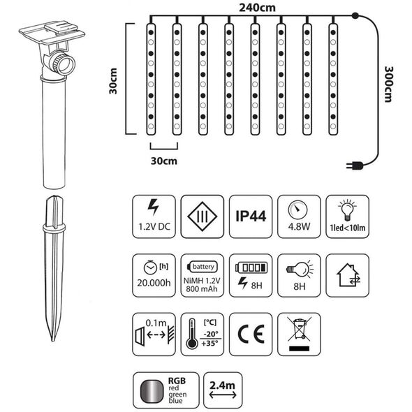 Niezwykle efektowne lampki solarne MCE412 zasilane energią słoneczną, stanowią tanie, niezawodne, efektywne oraz przyjazne dla środowiska naturalnego dekoracyjne oświetlenie. Nadają się do stosowania zarówno w środku pomieszczeń jak i na zewnątrz. Dzięki innowacyjnej formie zwisających sopli, lampki świetnie sprawdzą się do ozdabiania tarasu, patio, werandy, ganku, itp. Lampki składają się z 8 segmentów w formie sopli o długości 30 cm. Na lampkach znajdują się 144 diody LED świecące w kolorach: niebieskim, czerwonym i zielonym. Po pełnym naładowaniu akumulatora lampki świecą nawet do 8 godzin.