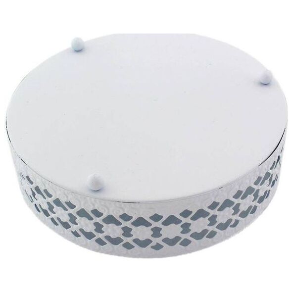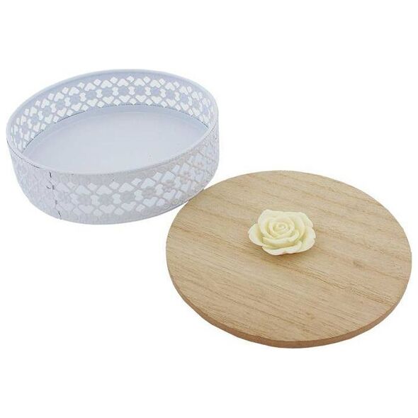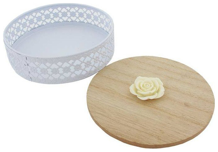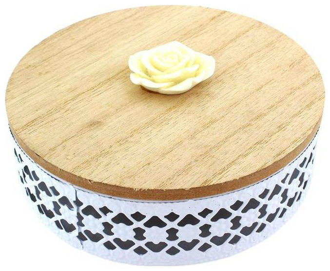 Solidny, metalowy pojemnik dekoracyjny z drewnianą pokrywką. Ażurowa konstrukcja umożliwia bieżący wgląd w jego zawartość. Pokrywka utrudnia rozsypanie się umieszczonych wewnątrz dekoracji. Świetnie sprawdzi się jako salonowy czy kuchenny bibelot. Cechy i specyfikacja produktu: Solidny, metalowy pojemnik dekoracyjny z pokrywką. Ażurowa konstrukcja umożliwia eksponowanie jego zawartości. Pokrywka zabezpiecza zawartość przed rozsypaniem się. Doskonale sprawdzi się jako salonowy, stylowy element ozdobny. Materiał: metal + drewno Średnica: 16 cm Wysokość: 10 cm Kolor: jak na zdjęciu