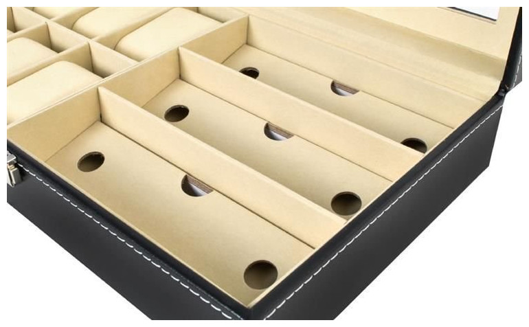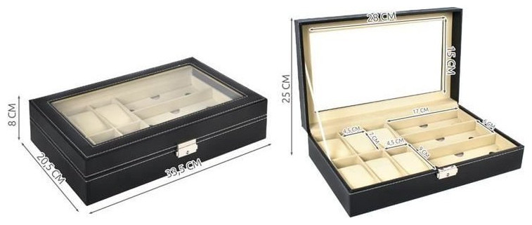 ΑΙΣΘΗΤΙΚΗ ΚΑΙ ΚΟΜΨΗ – η θήκη είναι κατασκευασμένη με προσοχή στη λεπτομέρεια, φαίνεται όμορφη και εμφανίζει όμορφα το περιεχόμενό της. Το προϊόν είναι κατασκευασμένο από μαύρο οικολογικό δέρμα με λευκές ραφές και φωτεινό εσωτερικό με τέλεια αντίθεση. Το καπάκι της θήκης είναι διαφανές, επομένως το κουτί του ρολογιού και των γυαλιών μπορεί να χρησιμοποιηθεί όχι μόνο για αποθήκευση και παραγγελία, αλλά και για κομψή εμφάνιση του περιεχομένου.