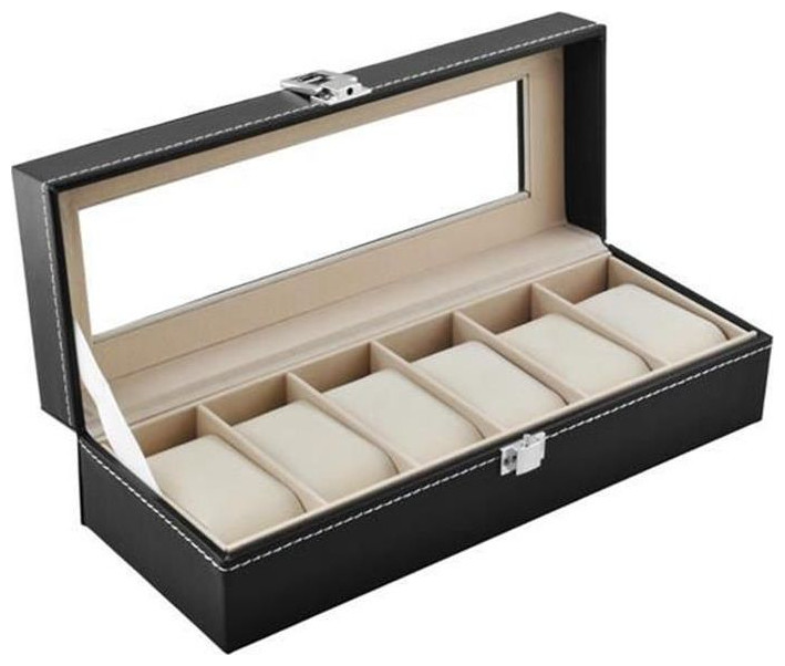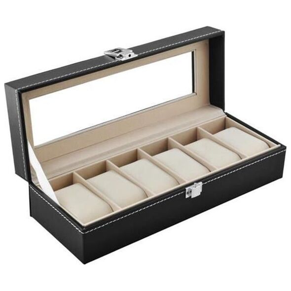 Ένας κομψός οργανωτής για την αποθήκευση ή την προβολή ρολογιών, βραχιολιών και άλλων κοσμημάτων. Το κουτί έχει 6 θήκες με αφαιρούμενα ένθετα που μπορούν να τοποθετηθούν υπό γωνία ή να αφαιρεθούν εντελώς, έτσι ώστε το κουτί να μπορεί να χρησιμοποιηθεί για την αποθήκευση άλλων κοσμημάτων.