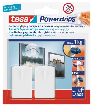 Ένα σετ δύο τεμαχίων από τετράγωνους πλαστικούς γάντζους tesa Powerstrips® για κρέμασμα φωτογραφιών. Θα αντικαταστήσουν με επιτυχία τα καρφιά, εξασφαλίζοντας σταθερή στερέωση στοιχείων βάρους έως 1 kg. Είναι επίσης κατάλληλα για κρέμασμα εικόνων, ημερολογίων, θερμόμετρων και άλλων αντικειμένων. Μπορούν να αφαιρεθούν και να επανατοποθετηθούν χρησιμοποιώντας το tesa Powerstrips®.