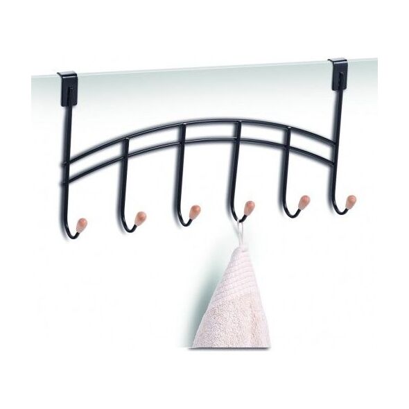 Ten praktyczny wieszak do zawieszenia na drzwi jest wykonany z wysokiej jakości metalu. Na wieszaku znajduje się 6 haczyków. Ich końcówki są drewniane, dzięki czemu nie przebijają się przez materiał ubrań. Wieszak stwarza dodatkową przestrzeń na przechowywanie, która bez niego nie jest wykorzystywana. Nadaje się na drzwi o maksymalnej grubości 2 cm. Wystarczy zawiesić konstrukcję na drzwiach i gotowe! Żadne narzędzia montażowe nie są wymagane. Rozmiar: 41x10x20,5 cm Materiał: Metal / Drewno Kolor: Czarny