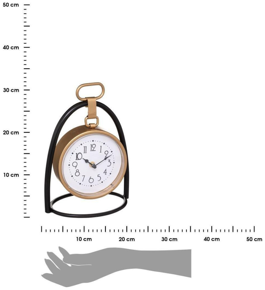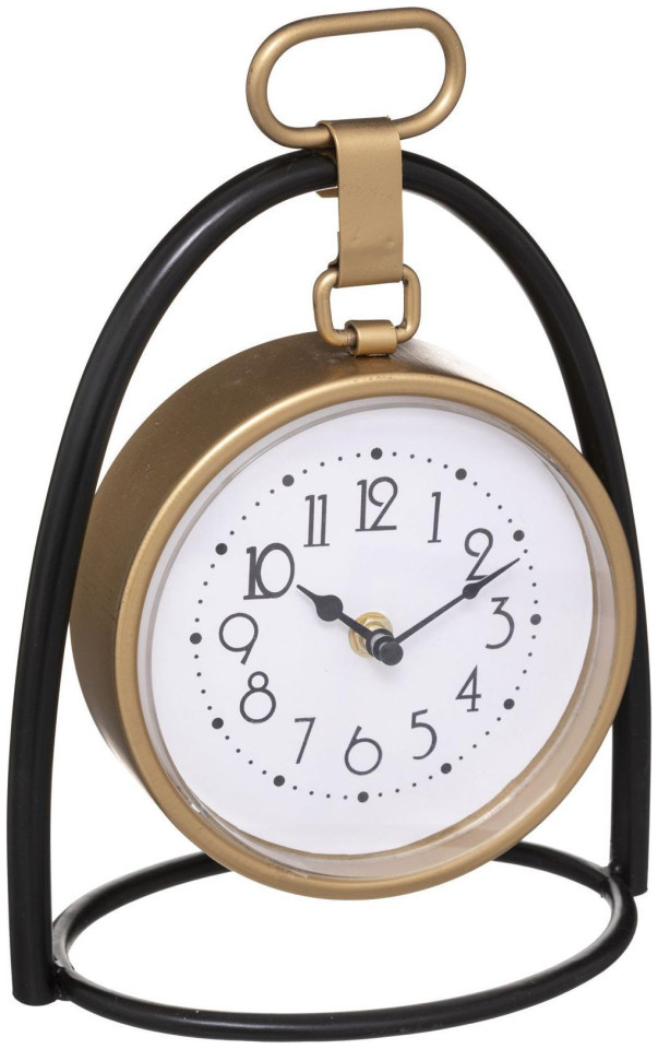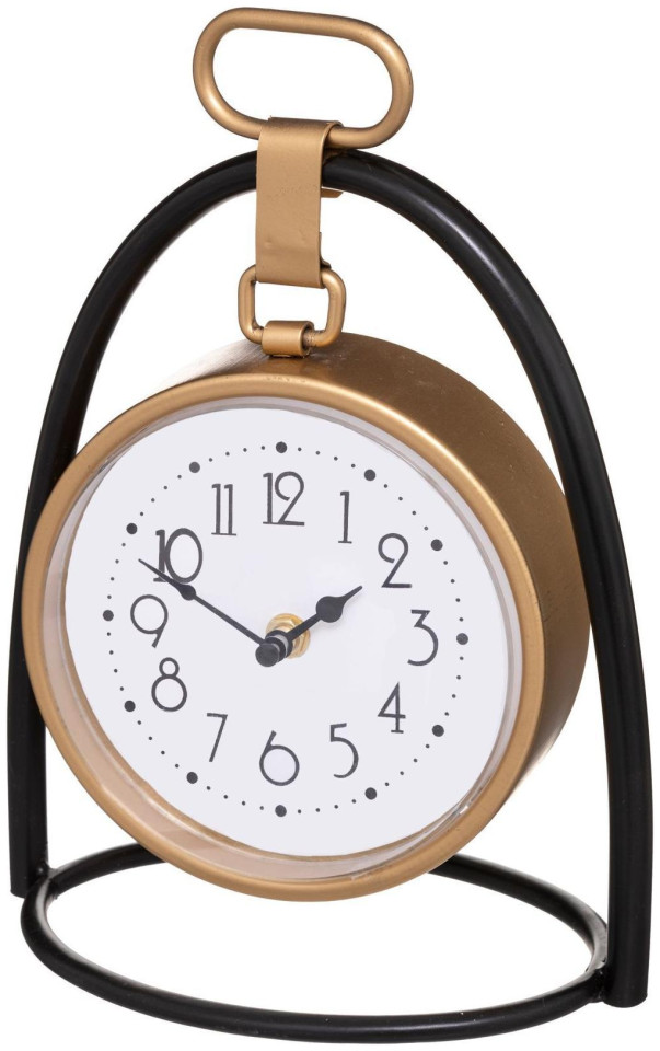 Επιτραπέζιο ρολόι Max σε μεταλλική βάση Κατασκευασμένο από χρυσό μέταλλο, σε στυλ σοφίτας, τοποθετημένο σε σταθερή μαύρη βάση Χαρακτηριστικά προϊόντος: Υλικά: Μέταλλο Χρώματα: Χρυσό / Μαύρο Στυλ: Ύψος σοφίτας: 27,5 cm Τροφοδοσία: 1xAA μπαταρία (όχι περιλαμβάνεται) Πλάτος : 21 cm Βάθος: 11 cm