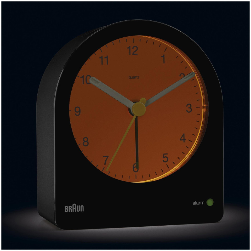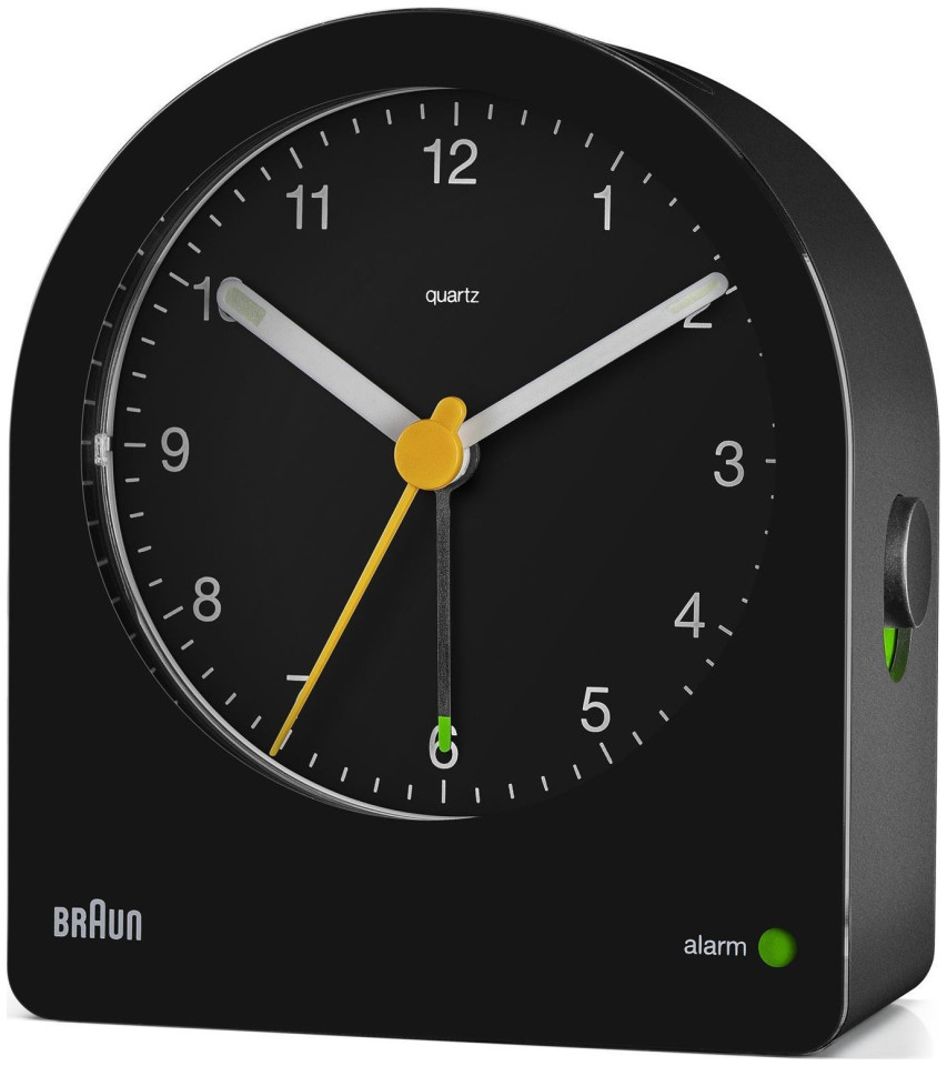 Braun BC22. Model: Kwarcowy budzik, Kształt: Okrągły, Kolor produktu: Czarny, Żółty. Typ wyświetlacza: Analogowy. Źródło zasilania: Bateria, Rodzaj baterii: AA. Szerokość produktu: 85,6 mm, Wysokość produktu: 97 mm, Głębokość produktu: 42 mm. Ilość na paczkę: 1 szt.