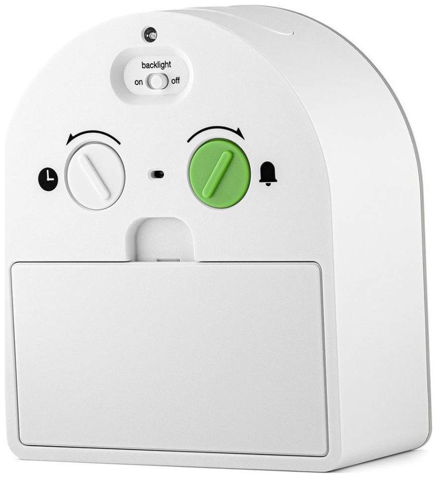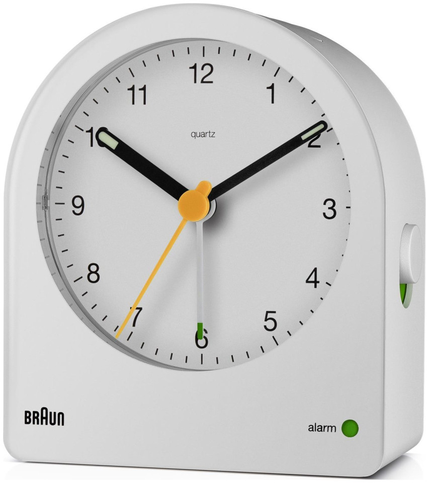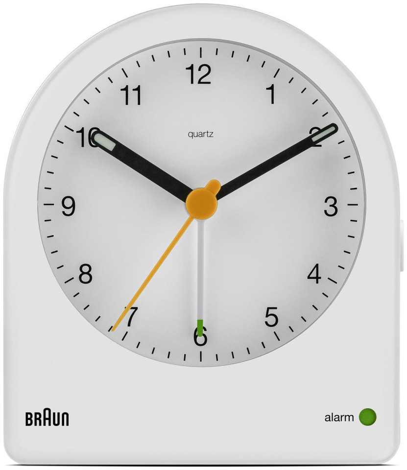 Braun BC22. Model: Kwarcowy budzik, Kształt: Okrągły, Kolor produktu: Biały, Żółty. Źródło zasilania: Bateria, Rodzaj baterii: AA. Szerokość produktu: 85,6 mm, Wysokość produktu: 97 mm, Głębokość produktu: 42 mm. Ilość na paczkę: 1 szt.