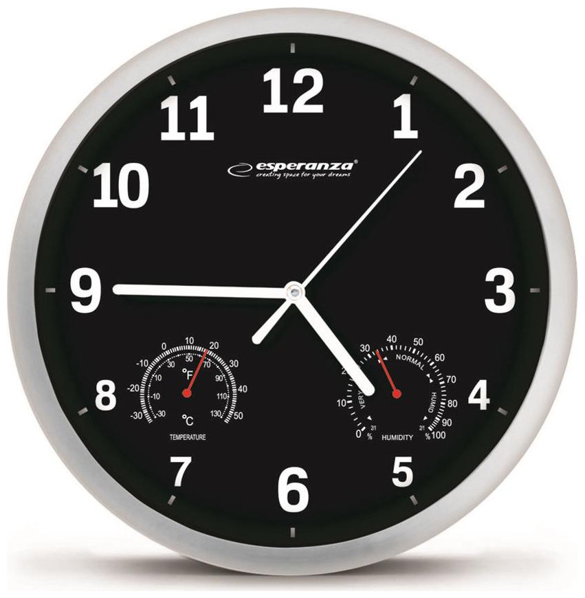 Το ρολόι είναι εξοπλισμένο με πρόσθετες επιλογές που δείχνουν τη θερμοκρασία και την υγρασία του αέρα.{Type} Τοίχος . {Type} Αναλογικό . {Ξυπνητήρι} Όχι. {Χρώμα}Μαύρο