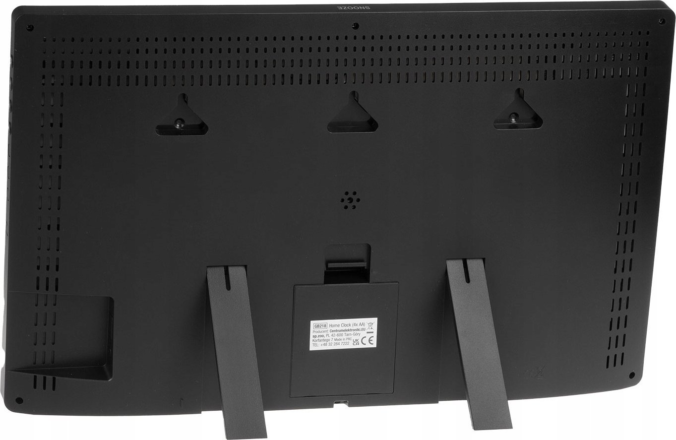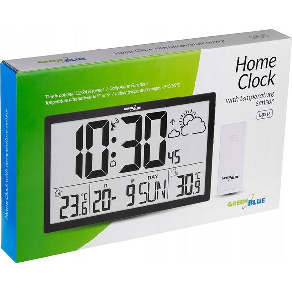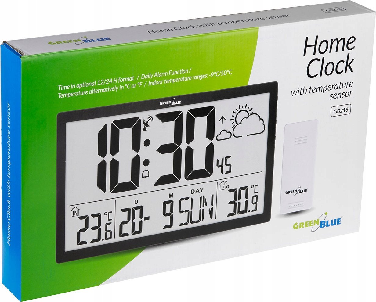GREENBLUE Zegar ścienny LCD wielofunkcyjny GB218Zegar wyposażony jest w system DCF, czyli automatyczną radiową synchronizację z zegarem atomowym we Frankfurcie. Dzięki zastosowaniu tego rozwiązania nasz zegar nigdy się nie spóźnia, a Ty już nigdy nie będziesz musiał się martwić o przestawienie zegarka.Typ: Cyfrowy Konstrukcja: Ścienny Mechanizm: Elektroniczny Budzik: Tak Zasilanie : Baterie/akumulatory AA Funkcja drzemki: Tak Funkcje specjalne: Funkcja czasu kontrolowanego radiowo DCF Bezprzewodowy czujnik temperatury zewnętrznej 433,92 MHz Odległość transmisji bezprzewodowej większa niż 60 m w otwartej przestrzeni Kalendarz do roku 2099 Dzień tygodnia w 7 językach (angielski, niemiecki, włoski, francuski, hiszpański, holenderski i duński) Opcjonalny czas w formacie 12/24 godzin Alarm z funkcją drzemki Wskaźnik niskiego poziomu baterii Zakres pomiaru temperatury wewnętrznej: od -9,9 do 50°C (14,2 do 122°F) Zakres pomiaru temperatury zewnętrznej: od -25 do 60°C (13 do 140°F) Temperatura opcjonalnie w °C lub °F Alarm oblodzenia Dzienny zapis maksymalnej/minimalnej temperatury Graficzna prognoza pogody Możliwość postawienia lub powieszenia Zasilanie: 4x bateria LR6 AA Kolor: czarny Kolor: Czarny