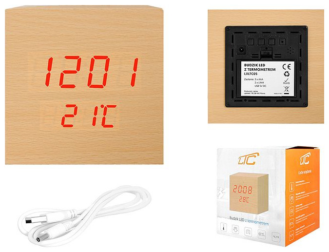 Ξυπνητήρι LTC, κύβος LED με θερμόμετρο, χρώμα φυσικού ξύλου Ρολόι κορυφαίας ποιότητας που εντυπωσιάζει με την τέλεια εμφάνισή του. Ο υπέροχος σχεδιασμός κάνει αυτό το ρολόι τόσο διακοσμητικό όσο και, πάνω απ 'όλα, λειτουργικό. Η συσκευή τροφοδοτείται από το καλώδιο USB που περιλαμβάνεται στο σετ ή από μπαταρίες AAA. Η καθαρή οθόνη LED επιτρέπει την ανάγνωση οποιαδήποτε στιγμή της ημέρας. Αυτή η συσκευή είναι εξοπλισμένη με έλεγχο ήχου. Αφού το ρολόι μεταβεί σε κατάσταση αναστολής λειτουργίας, απλώς χτυπήστε τα χέρια σας και η ώρα, η ημερομηνία ή η θερμοκρασία θα εμφανιστούν ξανά στην οθόνη Αυτή η συσκευή προσφέρει τη δυνατότητα εμφάνισης της θερμοκρασίας τόσο σε βαθμούς Κελσίου όσο και σε βαθμούς Φαρενάιτ. Ενσωματωμένο ξυπνητήρι, θερμόμετρο, ένδειξη ημερομηνίας και ρολόι, όλα συνδυασμένα σε μια μικρή συσκευή. Λειτουργίες Ώρα, ημερομηνία, ξυπνητήρι, θερμόμετρο Ενδείξεις οθόνης Έτος, μήνας, ημέρα, ώρα, λεπτό, θερμοκρασία Κουμπιά λειτουργίας 4 Εύρος μέτρησης θερμοκρασίας0 .... 50 μοίρες Λειτουργίες οθόνης CD3 Ενεργοποίηση της οθόνης Μέσω ήχου (π.χ. χτυπώντας τα χέρια) Τροφοδοτικό3 x AAA4 / 2 x LR USB 5 V DCD Διαστάσεις 98 x 98 x 98 mm{Type} Όρθια . {Type} Όρθια . {Ξυπνητήρι} Ναι. {Ξυπνητήρι} Ναι