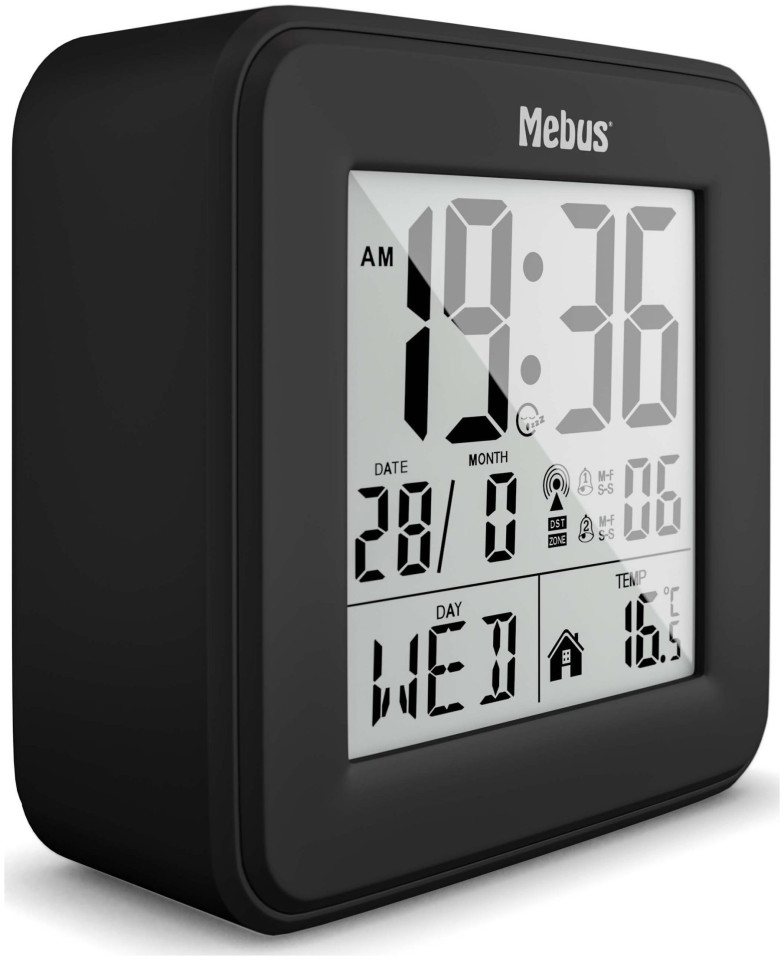 Mebus 25595. Μοντέλο: Ψηφιακό ξυπνητήρι, Σχήμα: Τετράγωνο, Χρώμα προϊόντος: Μαύρο. Αριθμός γραμμών κειμένου: 3 γραμμές. Πηγή ισχύος: Μπαταρία, Τύπος μπαταρίας: AA, Τάση μπαταρίας: 1,5 V. Πλάτος προϊόντος: 82 mm, Ύψος προϊόντος: 82 mm, Βάθος προϊόντος: 34 mm. Ποσότητα ανά συσκευασία: 1 τεμ.
