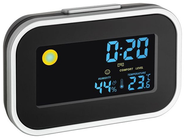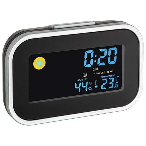 Εκτός από τη βασική λειτουργία του ξυπνητηριού, η συσκευή χρησιμοποιείται για τη μέτρηση της θερμοκρασίας και της υγρασίας του αέρα στα δωμάτια. Επιπλέον, το όργανο έχει μια συνάρτηση βασικών καιρικών προγνώσεων που υπολογίζονται με βάση τις αλλαγές στη θερμοκρασία και την υγρασία, καθώς και έναν δείκτη αίσθησης άνεσης. Ένα σημαντικό πλεονέκτημα του θερμοϋγρόμετρου είναι η έγχρωμη οθόνη (μετά το πάτημα ενός κουμπιού). {Ξυπνητήρι} Ναι