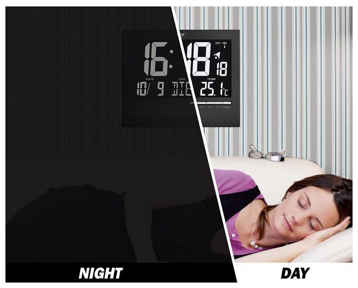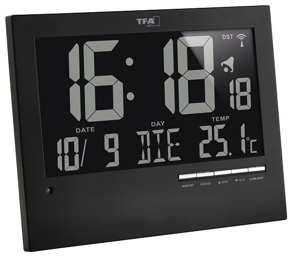Ηλεκτρονικό ρολόι τοίχου LCD TFA 60.4508 με θερμόμετρο. Η συσκευή δείχνει τη θερμοκρασία του αέρα εκτός της ώρας. Οι μεγάλες διαστάσεις του ρολογιού το καθιστούν κατάλληλο για χρήση στο γραφείο, στο σχολείο και στο σπίτι. Η οθόνη του ρολογιού δείχνει τη μεγάλη ώρα σε μορφή 24 ή 12 ωρών, καθώς και τιμές θερμοκρασίας, ημερομηνία και ημέρα της εβδομάδας. Το ρολόι ελέγχεται από ένα ραδιοσήμα DCF-77.