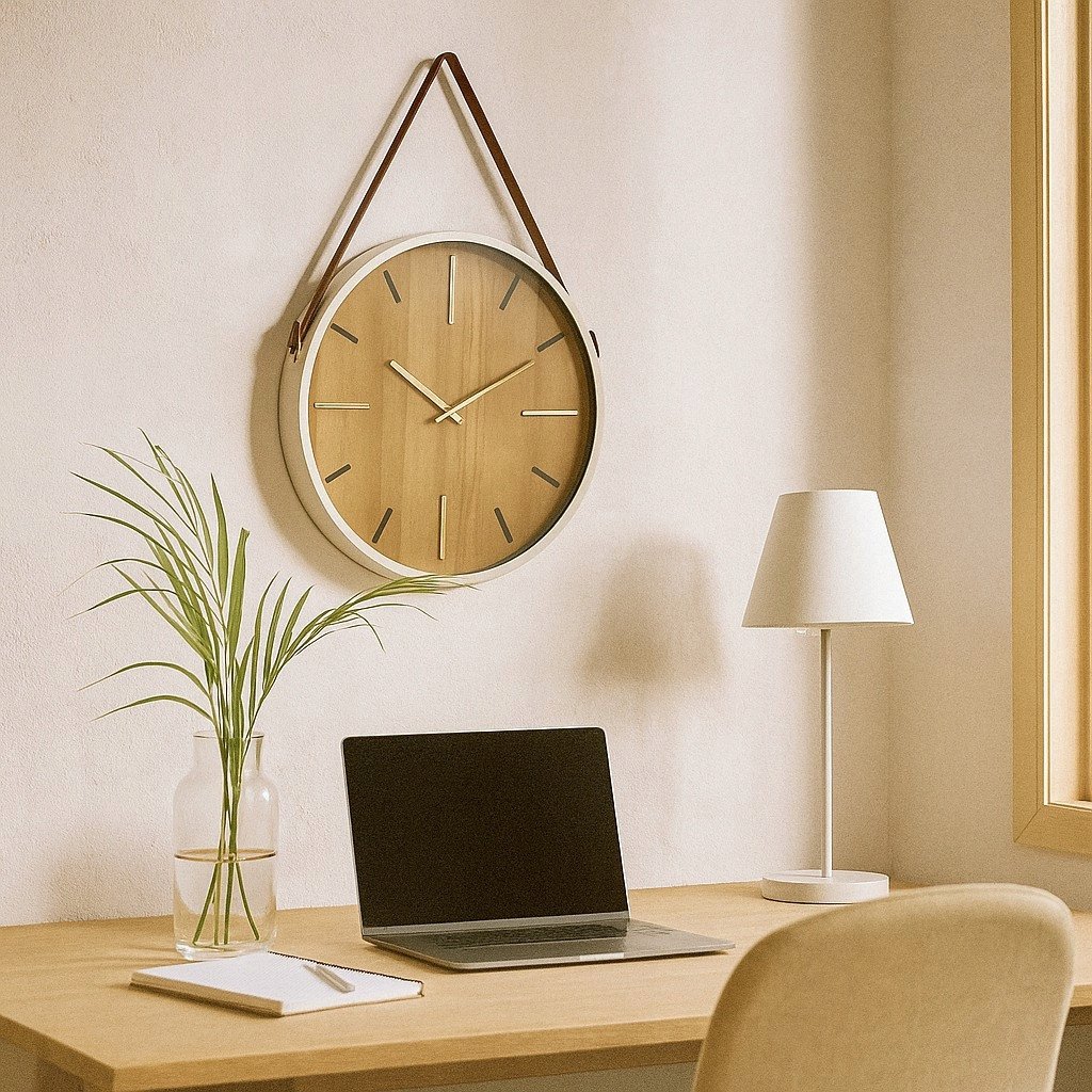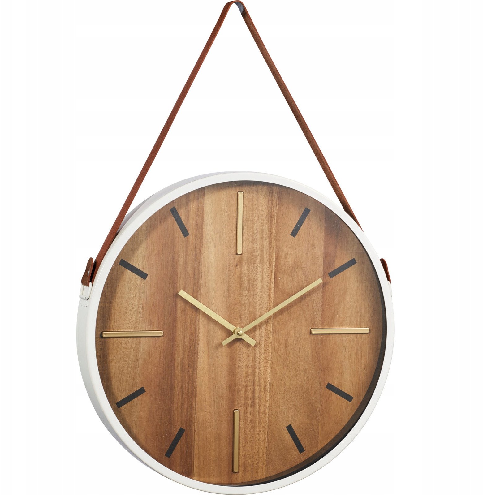 Φέρτε ζεστασιά και φυσική κομψότητα στον χώρο σας με αυτό το πανέμορφο ρολόι τοίχου με ξύλινη επιφάνεια και δερμάτινο ιμάντα ανάρτησης. Ο μίνιμαλ σχεδιασμός του, σε συνδυασμό με τους χρυσούς δείκτες και δείκτες ώρας, προσδίδει διακριτική πολυτέλεια και διαχρονικό στυλ. Χαρακτηριστικά