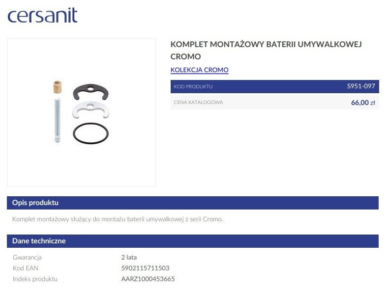 Cersanit KOMPLET MONTAŻOWY BATERII UMYWALKOWEJ CROMO (S951-097)