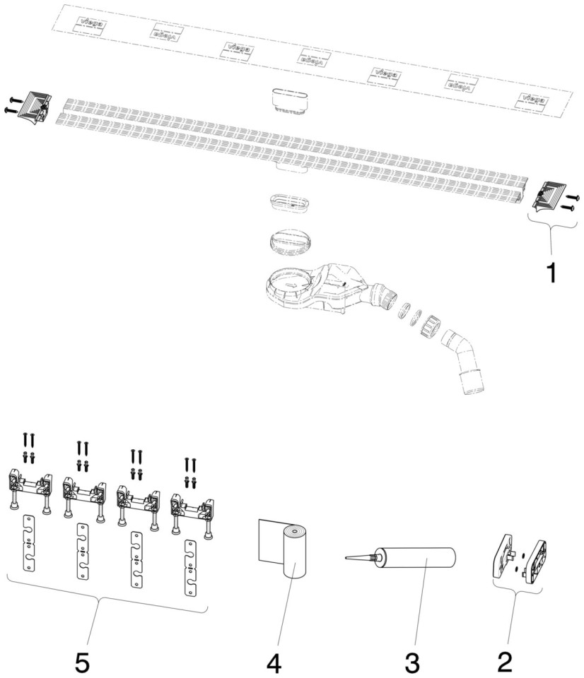 Σετ ρυθμιζόμενα πόδια, καπάκια, αυτοκαθαριζόμενα σετ απορριμμάτων, στοιχεία στερέωσης σχάρας με εύρος ρύθμισης, φλάντζα στεγανοποίησης, εξαρτήματα στεγανοποίησης, βοήθημα κοπής