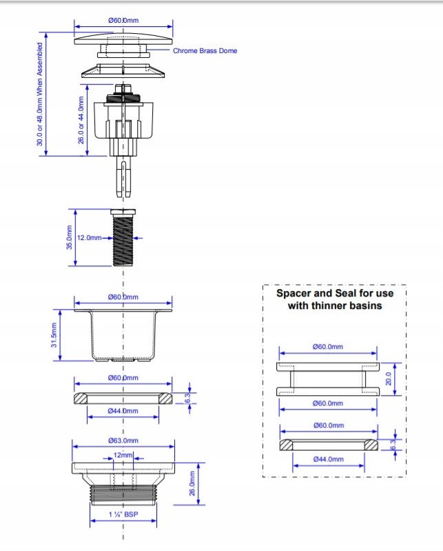 Πώμα KLIK-KLAK 11/4x60MM UNIWERSALNY NISKI CZ.MAT