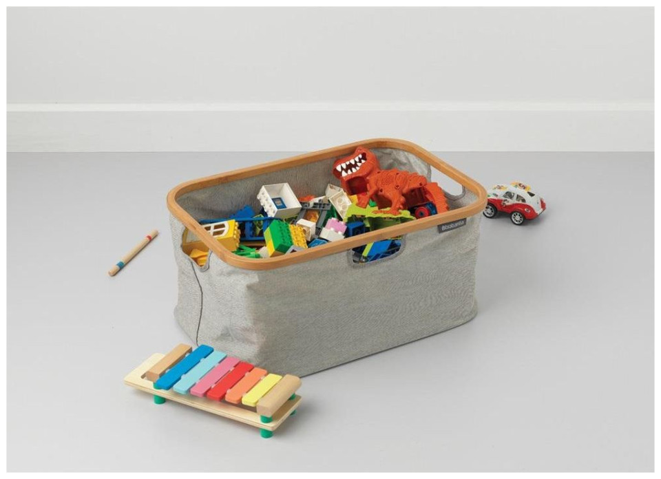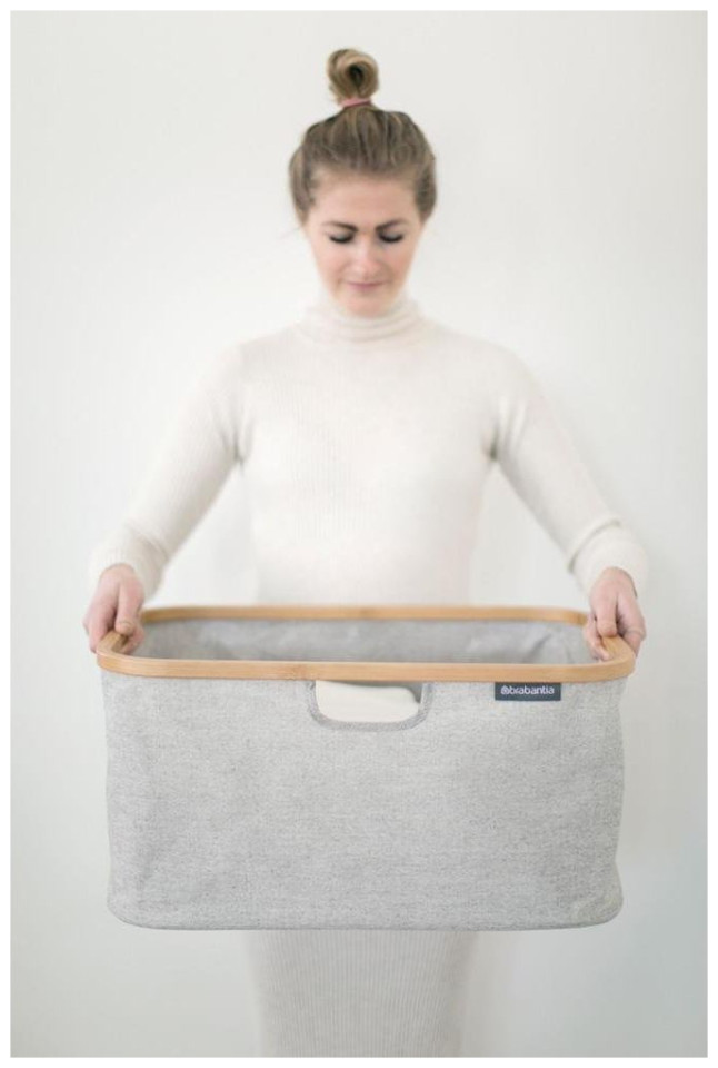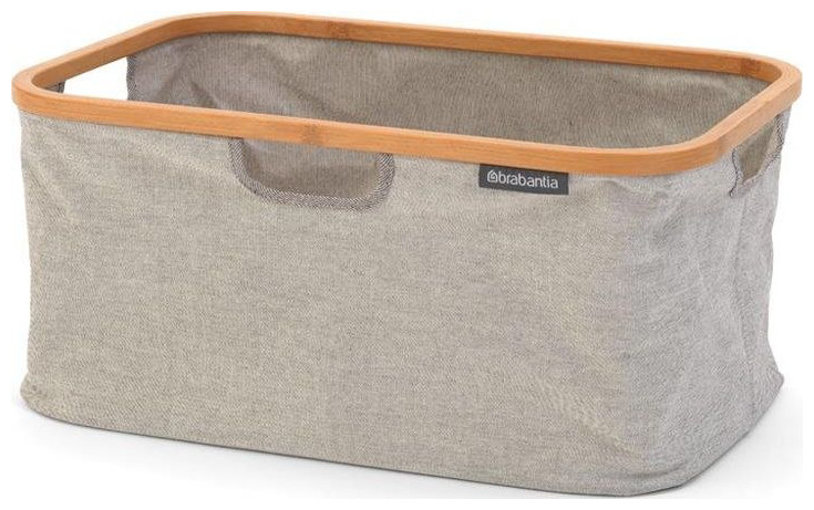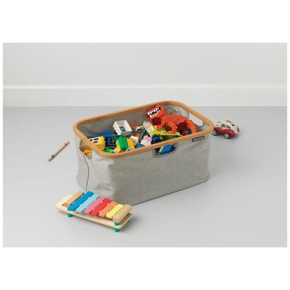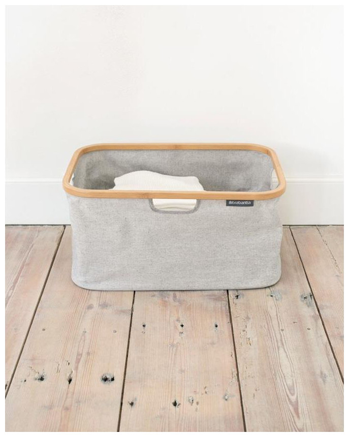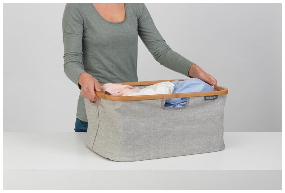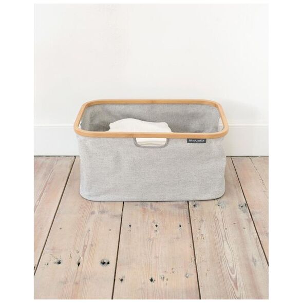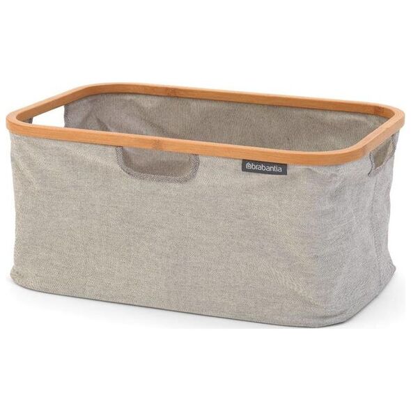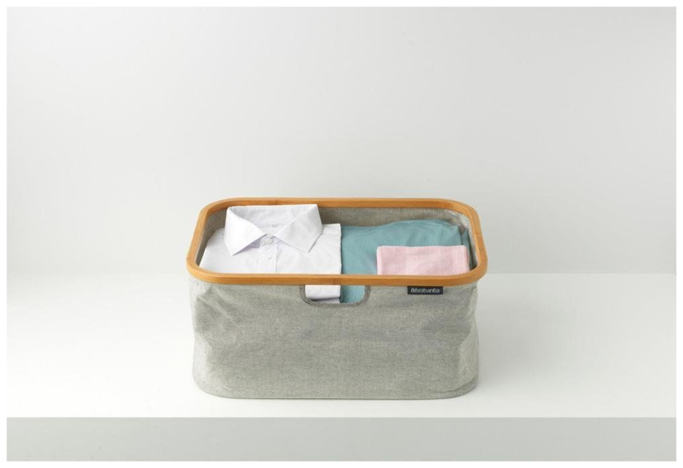 Αναδιπλούμενο γκρι καλάθι ρούχων με μπαμπού στεφάνη χωρητικότητας 40l και διαστάσεων 54x36x26,5cm.