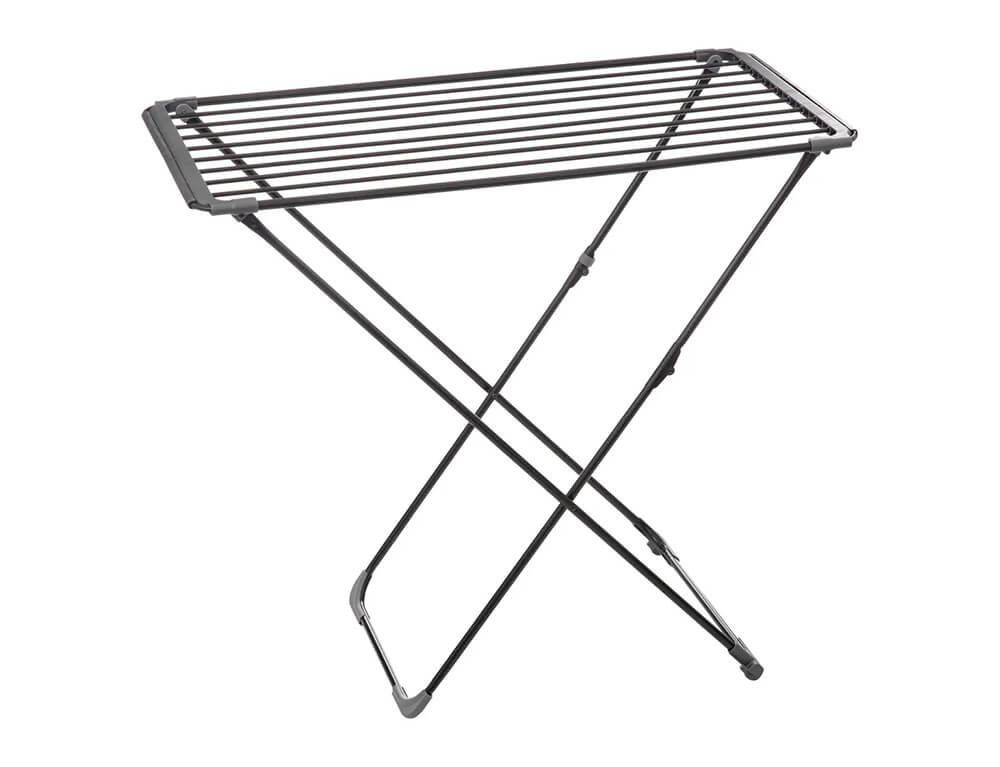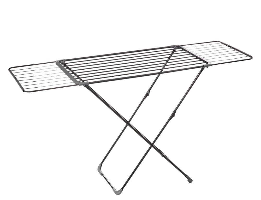 Πτυσσόμενη απλώστρα δαπέδου από την εταιρεία 5five. Με συνολικό μήκος απλώματος 20 μέτρα, χωράει τα ρούχα, τις πετσέτες ή τα σεντόνια σας. Είναι κατασκευασμένη από ανθεκτικό μεταλλικό υλικό σε μαύρο χρώμα και διπλώνει ώστε να αποθηκεύεται εύκολα όταν δεν την χρησιμοποιείτε για εξοικονόμηση χώρου.