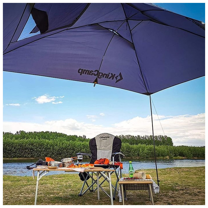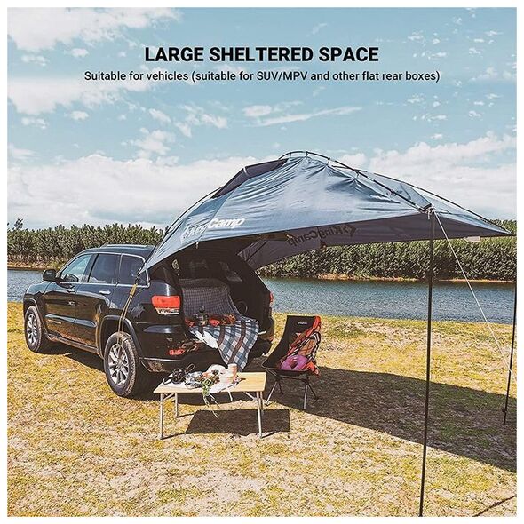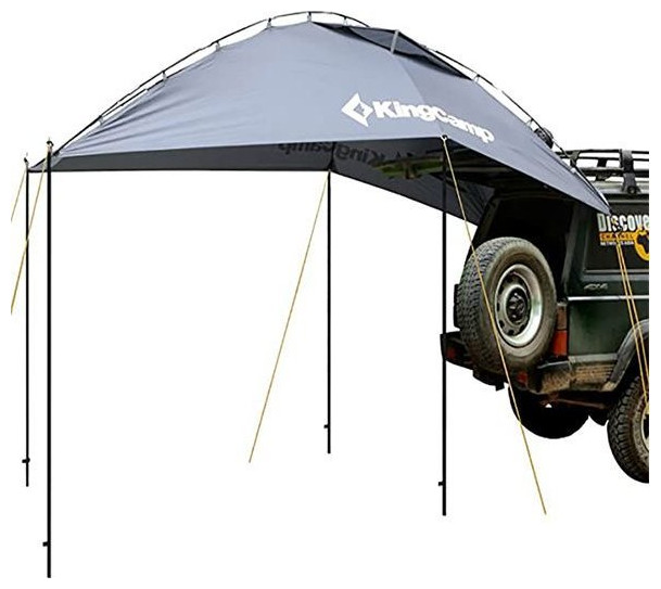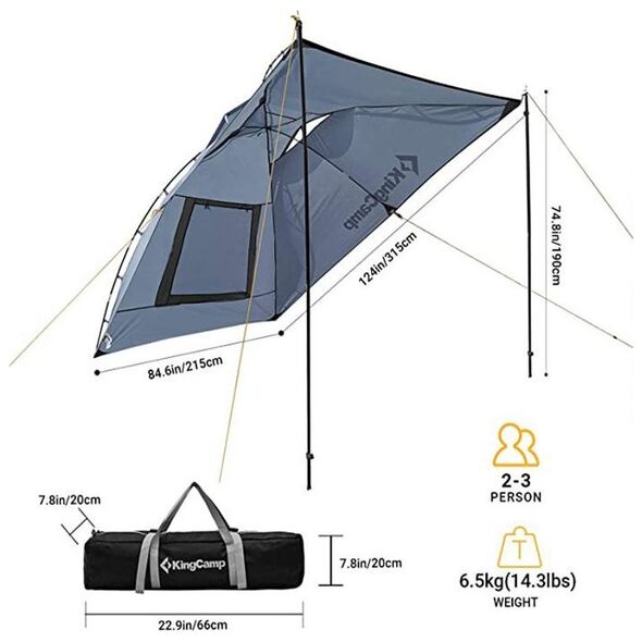 Σκηνή αυτοκινήτου με πυξίδα KING CAMP - Γκρι Η Σκηνή αυτοκινήτου KING CAMP Compass - Grey διαθέτει χώρο σκίαστρου για διάφορους σκοπούς (που κυμαίνονται από 60+ έως 76+ τετραγωνικά πόδια). Μέγεθος: 124" x 84,6", αρκετά μεγάλο για να καλύψει τραπέζι, καρέκλες, ψυγεία και κατοικίδια. Η σκηνή είναι κατασκευασμένη από ύφασμα πολυεστέρα rip-stop 210 T με επίστρωση PU 1500 mm για προστασία από την τριβή. Οι οπές εξαερισμού στην οροφή της σκηνής επιτρέπουν στο αεράκι να ρέει μέσα. Τα μεγάλα πλαϊνά παράθυρα παρέχουν επαρκή αερισμό. Η σκηνή περιλαμβάνει 3 πόλους απορρόφησης κραδασμών από υαλοβάμβακα, 4 στηρίγματα σιδερένιων σωλήνων, 4 κορδόνια περίσφιξης, 2 σχοινιά αυλάκωσης, 8 καρφιά εδάφους και 2 χαλύβδινους πόλους θόλου σταθεροποιούν τη σκηνή του τρέιλερ, καθιστώντας την πολύ γρήγορη και εύκολη στη συναρμολόγηση. Το σετ περιλαμβάνει 2 σχοινιά ανέμου που μπορούν να χρησιμοποιηθούν για τη διατήρηση της σταθερότητας. Προσαρμόζεται στο θόλο ενός οχήματος όπως SUV, MPV, φορτηγό, hatchback ή αυτοκίνητο. Μπορεί να χρησιμοποιηθεί ως κιόσκι. Μπορεί επίσης να χρησιμοποιηθεί ως επίγειο καταφύγιο με ατσάλινους στύλους. Φορητή τσάντα μεταφοράς με λαβές με φερμουάρ για εύκολη μεταφορά και αποθήκευση.