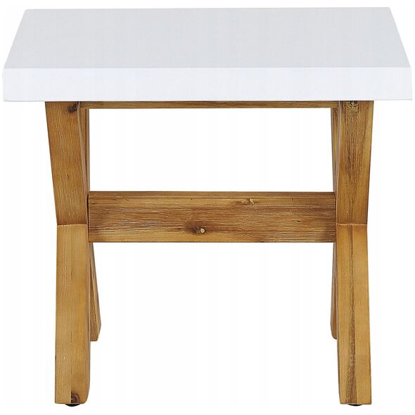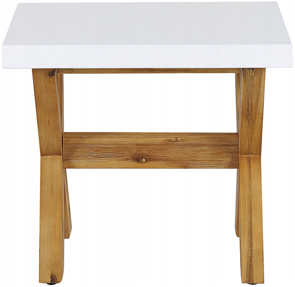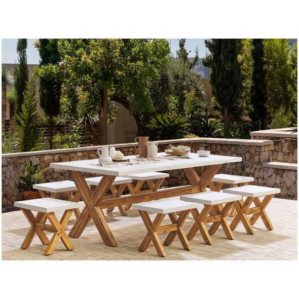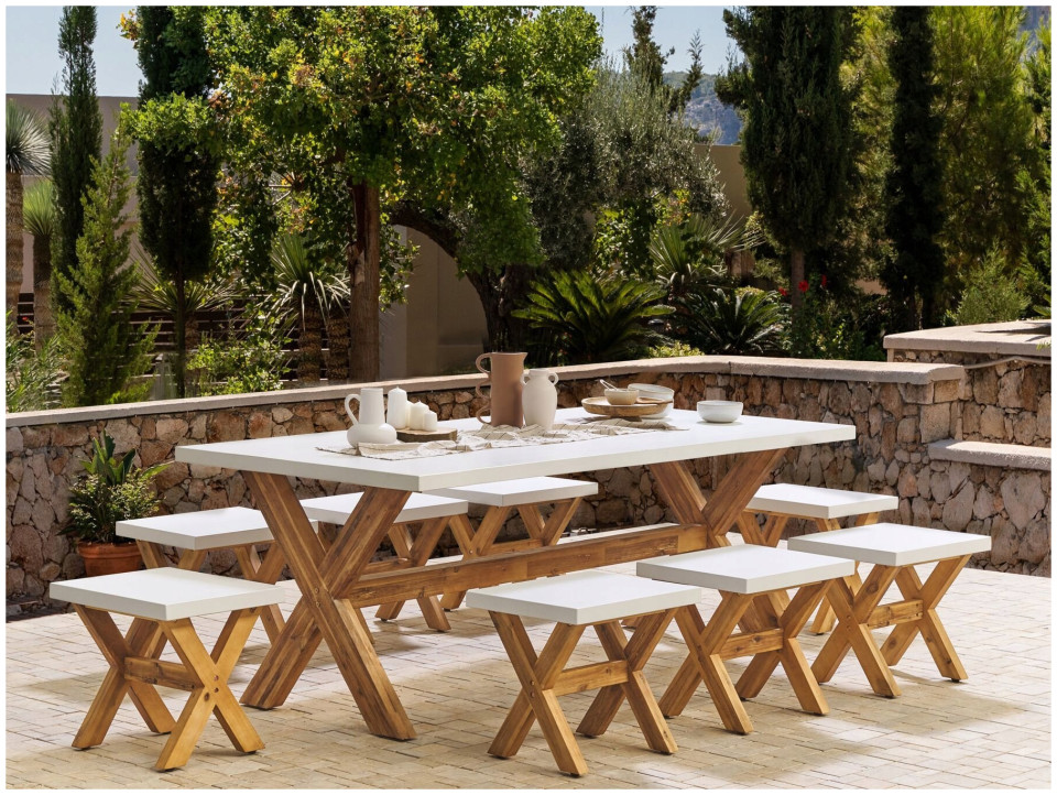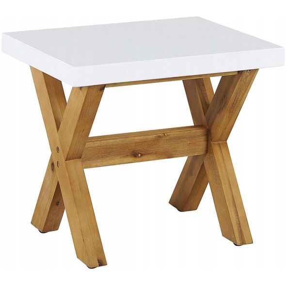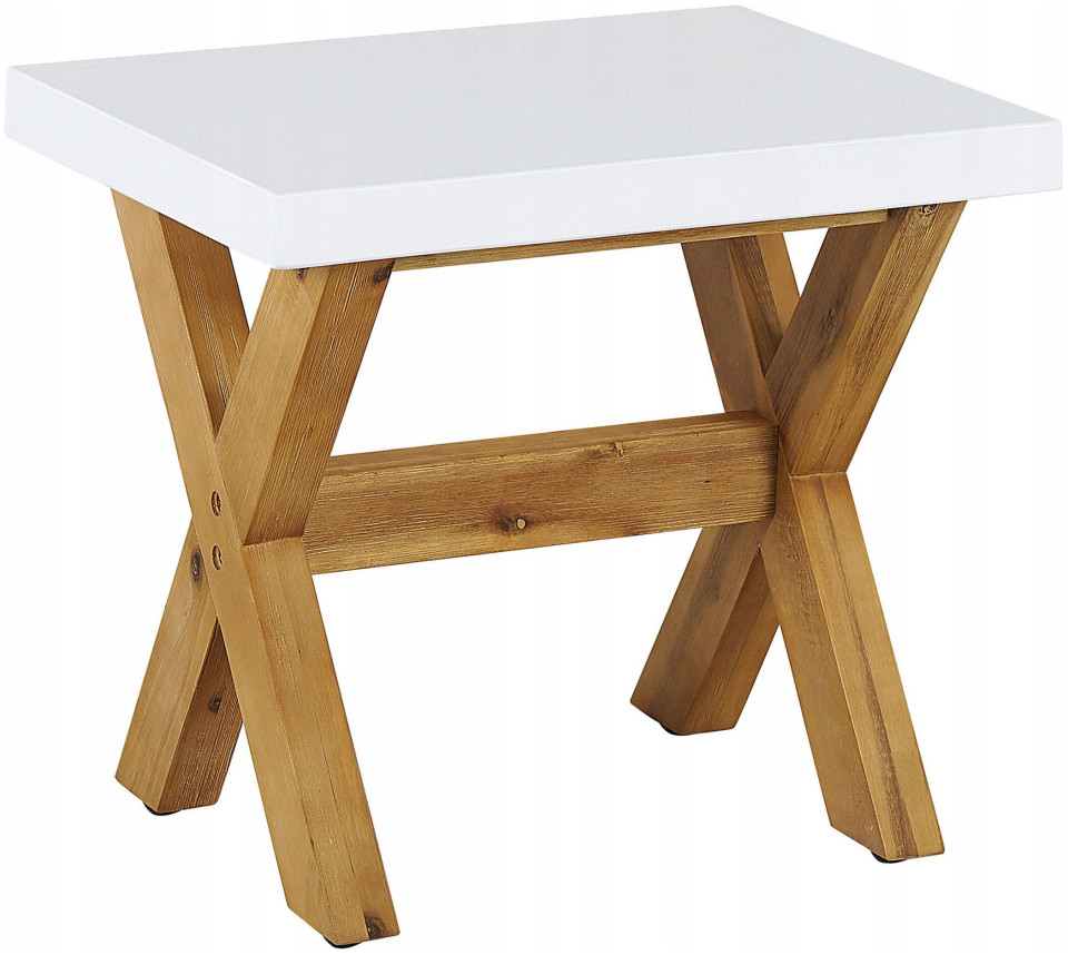 Dodaj dodatkowe siedzisko do swojego stołu ogrodowego za pomocą tego stołka. Jego górna część wykonana została z płyty włóknowo-cementowej, dzięki czemu stołek jest wytrzymały i służyć będzie przez wiele lat, nie wymagając przy tym częstej pielęgnacji. Baza wytworzona jest z drewna akacjowego, które nie tylko gwarantuje stabilność mebla, ale i tworzy przyciągające uwagę połączenie kolorystyczne. Stołek sprawdzi się świetnie w przestrzeniach zewnętrznych dzięki swojej odporności na deszcz i zmienną pogodę. Jego minimalistyczny design pozwoli na dopasowanie go do najróżniejszych przestrzeni, od nowoczesnych po te industrialne, czy utrzymane w klimatach retro.
