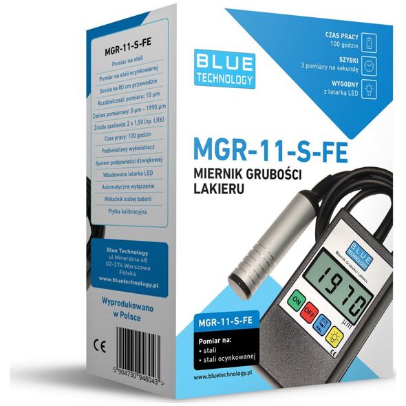 Cechy urządzenia: Pomiar na: stal, stal ocynkowana Wykrywane podłoża: stal Rodzaj sondy: płaska Rozdzielczość pomiaru: 10µm Zakres pomiarowy: 0-1990µm Zasilanie: 2x AA Zakres temperatur w jakich miernik może pracować: od -20°C do +40°C