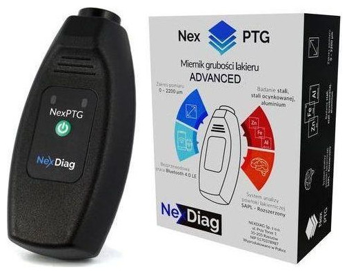 NexPTG Advanced μετρητής πάχους χρώματος αλουμινίου και χάλυβα με εφαρμογή iOS Android Μοντέλο: NexPTG Advanced Κατασκευαστής: NexDiagMade in PolandΟ παρουσιαζόμενος μετρητής πάχους χρώματος χρησιμοποιείται για τη μέτρηση του στρώματος βαφής σε ένα αμάξωμα αυτοκινήτου από χάλυβα, γαλβανισμένο χάλυβα ή αλουμίνιο Η λύση είναι η ενοποίηση του μετρητή με τη συσκευή κινητής συσκευής με σύστημα Android ή iOS, π.χ. εξαγωγή μετρήσεων, δημιουργία αναφορών, είναι επίσης πιο βολικό να κάνετε μετρήσεις κάνει την εργασία με αυτόν τον μετρητή πιο βολική Το προϊόν κατασκευάζεται 100% στην Πολωνία. Οι συσκευές NexPTG εκτελούν 10 μετρήσεις ανά δευτερόλεπτο και δείχνουν πολύ ακριβή ένδειξη, επιπλέον, μπορούμε να τις χρησιμοποιήσουμε για να ελέγξουμε σχεδόν οποιοδήποτε αυτοκίνητο. Το NexPTG αναγνωρίζει και εξετάζει αυτόματα την επίστρωση βαφής σε στοιχεία από χάλυβα και αλουμίνιο Το Advanced είναι ένα υψηλότερο μοντέλο του μετρητή NexPTG, που σας επιτρέπει να εκτελείτε γρήγορες και ακριβείς μετρήσεις του στρώματος βαφής. Επιπλέον, ο μετρητής διαθέτει μια σειρά από καινοτόμες επιλογές που θα βοηθήσουν τον χρήστη να εξετάσει το όχημα πιο εύκολα και αποτελεσματικά Η σύνδεση του μετρητή με ένα τηλέφωνο παρέχει τεράστιες δυνατότητες που δεν είναι εφικτές για τους παραδοσιακούς μετρητές. Επιπλέον, εμπλουτίζεται συνεχώς με πρόσθετες λειτουργίες, όπως: