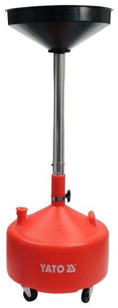 Κινητό σιφόνι λαδιού. Εξοπλισμένο με μπανιέρα, χοάνη με ρυθμιζόμενο ύψος, 4 τροχούς και βαλβίδα για την απόρριψη χρησιμοποιημένου λαδιού ή υγρού σε δοχείο συλλογής.