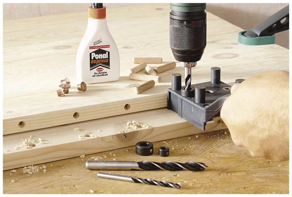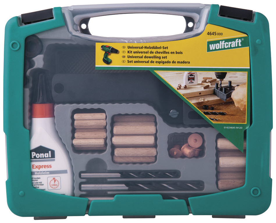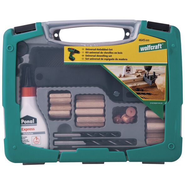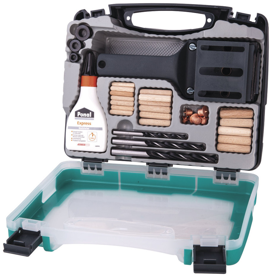 Το σετ περιλαμβάνει: 1 x πείρο αρμού 26 x ξύλινους πείρους, ø 6 mm22 x ξύλινους πείρους, ø 10 mm3 x τρυπάνια ξύλου, ø 6, 8, 10 mm6 x μαρκαδόρους, το καθένα 2 τεμ. 8, 10 mm3 x στάσεις βάθους διάτρησης, ø 6, 8, 10 mm1 x κόλλα ξύλου, 20 ml