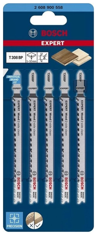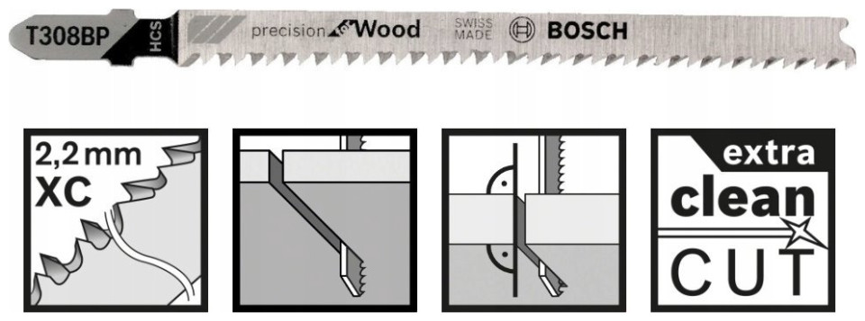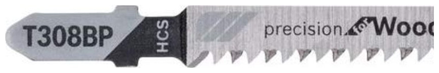 WOOD SAW BLADE T 308 BP Κατασκευαστής BOSCH αρ , ξυλουργικές σανίδες μη λειαντικά ξύλινα υλικά Η λεπίδα σέγας T 308 BP Precision for Wood επιτρέπει ακριβείς, πολύ καθαρές ίσιες κοπές στο ξύλο κωνικά δόντια. αλεσμένη πλάτη - καθαρή κοπή και δύο σειρές δοντιών - κοπή χωρίς ξέφτισμα Η λεπίδα από χάλυβα υψηλής περιεκτικότητας σε άνθρακα είναι κατάλληλη για την κοπή μαλακού ξύλου και μη λειαντικών ξύλινων υλικών Περιγραφή προϊόντος Η λεπίδα σέγας T 308 BP Precision for Wood επιτρέπει την ακρίβεια. πολύ καθαρές ευθείες κοπές σε ξύλο. Το αυξημένο πάχος της λεπίδας την εμποδίζει να λυγίσει και επιτρέπει την ακριβή κοπή υπό ακριβή γωνία. Τα επακριβώς αλεσμένα δόντια λεπίδας με κωνικά αλεσμένη ράχη εξασφαλίζουν καθαρό κόψιμο και δύο σειρές δοντιών τοποθετημένες σε διαφορετικές γωνίες επιτρέπουν την κοπή χωρίς ξεφτίσματα τόσο στην επάνω όσο και στην κάτω επιφάνεια. Το υλικό αυτής της λεπίδας από χάλυβα υψηλής περιεκτικότητας σε άνθρακα (HCS) είναι κατάλληλο για την κοπή μαλακού ξύλου και μη λειαντικών υλικών ξύλου. Χάρη στη γεωμετρία των δοντιών 2,2XC και το λεπτό βήμα των δοντιών (2,2 mm), η λεπίδα του πριονιού μπορεί να κόψει ξύλινα υλικά με πάχος 5-50 mm. Για χρήση με σέγες με στέλεχος λαβής Τ Ξεκινήστε την κοπή από το κέντρο του υλικού χωρίς να τρυπήσετε μια τρύπα χάρη σε ειδικά μπροστινά δόντια κοπής