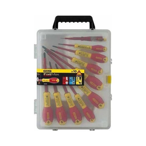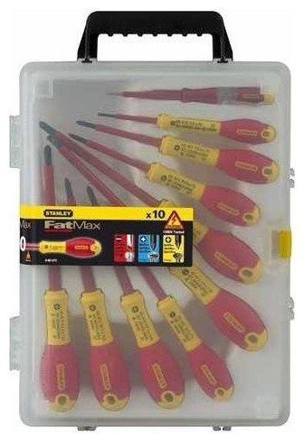 Σετ 10 εργαλείων για ηλεκτρολόγους, ημιεπαγγελματίες FMHT62573-0 Stanley Περιγραφή Πληροί το πρότυπο EN609900 Δοκιμασμένο σε 1000V Μόνωση μύτης, κατασκευασμένο από χάλυβα υψηλής ποιότητας που εξασφαλίζει υψηλή ποιότητα των εργαλείων. Η λαβή που γίνεται απευθείας στο άκρο εξασφαλίζει την άφθαρτη σύνδεση και την ανθεκτικότητα του εργαλείου. Η λαβή Soft Grip επιτρέπει τη σταθερή λαβή του κατσαβιδιού. Η μεγάλη διάμετρος της λαβής επιτρέπει υψηλή ροπή. Η στενή λαβή και η λεία άκρη διευκολύνουν τη γρήγορη και ακριβή εργασία. Το άκρο της λαβής σε χρώμα αντίστοιχο του τύπου μύτης - εύκολη αναγνώριση του κατσαβιδιού στην κατάλληλη βίδα. Σετ 10 εργαλείων ηλεκτρολόγου (EN60900): Flat ίσο 2,5 x 50 mm; 3,5 x 75 mm; 5,5 x 150 mm; Κατσαβίδι Phillips Ph 0 x 75 mm; Ph 1 x 100 mm; Ph 2 x 125 mm; Κατσαβίδι Pozidriv Pz 0 x 75 mm; Pz 1 x 100 mm; Pz 2 x 125 mm; Δοκιμαστής τάσης
