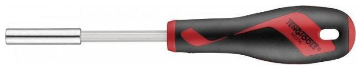 Wkrętak do grotów wymiennych z chwytem w formie nasadki sześciokątnej 1/4", z magnesem przytrzymującym zarówno grot jak i wkręt. Trzon sześciokątny ze stali chromowo-wanadowej. Ergonomiczna rękojeść dwukomponentowa, w rozmiarze L (Large), z otworem do zawieszania....