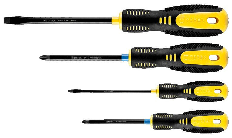 Σετ κατσαβιδιών TOPEX (κωδ. 39D933) πολύ χρήσιμο για μηχανικές εργασίες και DIY. Η άκρη καθενός από τα τέσσερα κατσαβίδια είναι κατασκευασμένη από ανθεκτικό χάλυβα χρωμίου-βαναδίου, εξασφαλίζοντας μεγάλη διάρκεια ζωής του εργαλείου. Το μαγνητικό άκρο από σκληρυμένο χάλυβα διευκολύνει τη χρήση του εργαλείου. Εργονομική πλαστική λαβή καλυμμένη με αντιολισθητικό υλικό εξασφαλίζει άνεση και ασφάλεια κατά την εργασία. Η μάρκα TOPEX απευθύνεται σε λάτρεις των DIY.