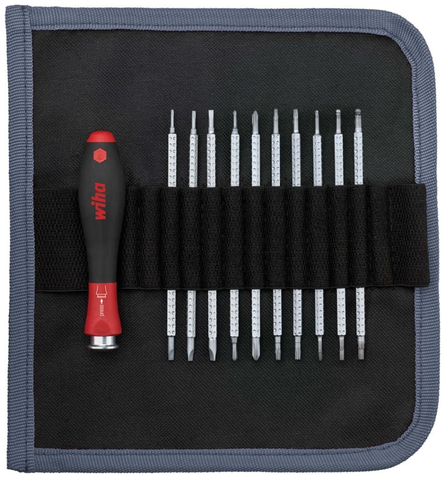 Αυτό το πλήρες σετ SYSTEM 4 11 τεμαχίων, που περιέχει αντικαταστάσιμα κατσαβίδια Wiha, είναι τέλειο για τους λάτρεις του DIY και τους επαγγελματίες. Η εργονομική, μαλακή λαβή παρέχει ιδανική ροπή και άνεση χρήσης για τα χέρια και τους μύες, ακόμη και κατά τη μακροχρόνια εργασία. Το κουμπί κλειδώματος και απελευθέρωσης καθιστά εύκολο τον χειρισμό. Αυτό το ευέλικτο σετ εξοικονόμησης χώρου με εναλλάξιμα εργαλεία είναι ιδανικό τόσο για τους λάτρεις της DIY όσο και για τους επαγγελματίες. x 5,8 cm (Μ x Π x Υ) Εναλλάξιμα bits Με κουμπί κλειδώματος και απελευθέρωση Ρυθμιζόμενο μήκος άξονα από 18 έως 90 mm Λαβή με μαλακή λαβή Απλή λειτουργία Περιεχόμενα παράδοσης: 1 x SYSTEM 4 ανταλλακτική λεπίδα με μπάλα και 1,5, 1,5" κλειδί Allen x 120 mm 1 x SYSTEM 4 αντικαταστάσιμη λεπίδα με μπάλα και 2, 2" Allen κλειδί x 120 mm1 x αντικαταστάσιμη μύτη SYSTEM 4 με μπάλα και κλειδί Κλειδί Allen 2,5, 2,5" x 120 mm1 x αντικαταστάσιμη μύτη SYSTEM 4, Phillips PH000-PH00 x 120 mm1 x αντικαταστάσιμη άκρη SYSTEM 4, Phillips PH0-PH1 x 120 mm1 x αντικαταστάσιμη μύτη SYSTEM 4, επίπεδη 1,5 x 1 mm, x SYSTEM 4 αντικαταστάσιμη άκρη, επίπεδη 2,0-3,5 x 120 mm1 x εναλλάξιμη μύτη SYSTEM 4, επίπεδη 2,5-4,0 x 120 mm1 x εναλλάξιμη μύτη SYSTEM 4, TORX® T6-T8 x 120 mm1 x εναλλάξιμη μύτη SYSTEM 4, TORX® T7® Soft® Soft® Soft 1 x -τηλεσκοπική θήκη για ανταλλάξιμα bit 4.0 SYSTEM 41 x περιτυλιγμένη θήκηΣετ {Tip Shape} . Σετ {Tip Shape} . {Type} Για άκρα . {Type} Για άκρα