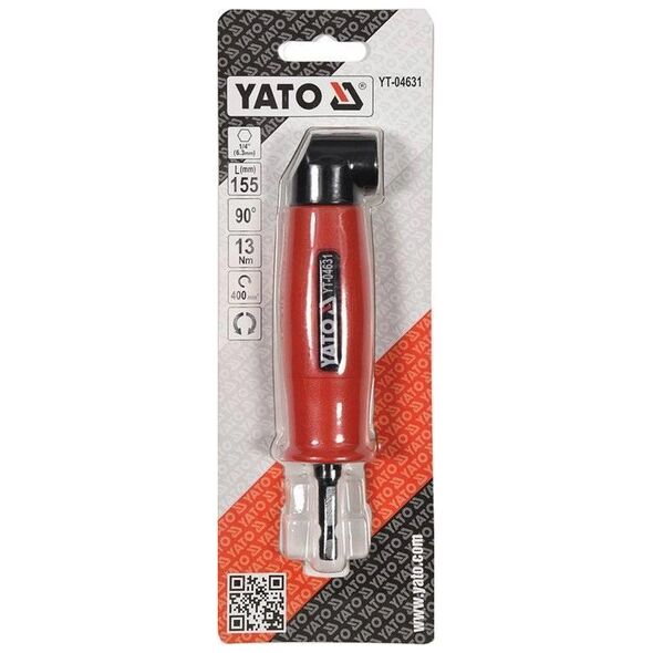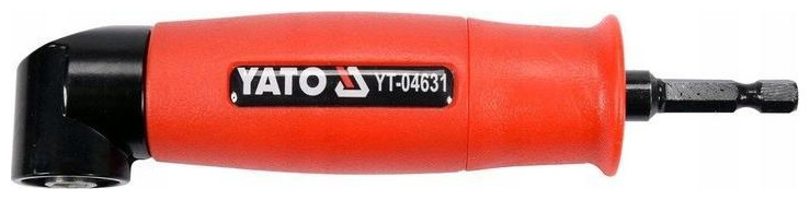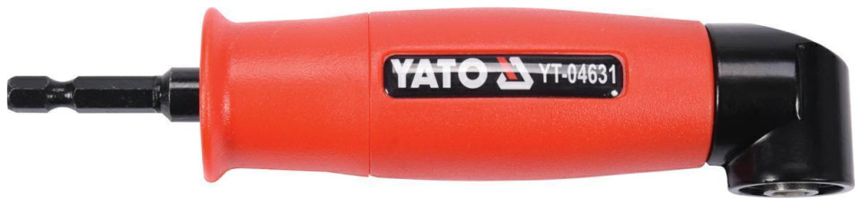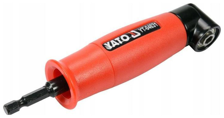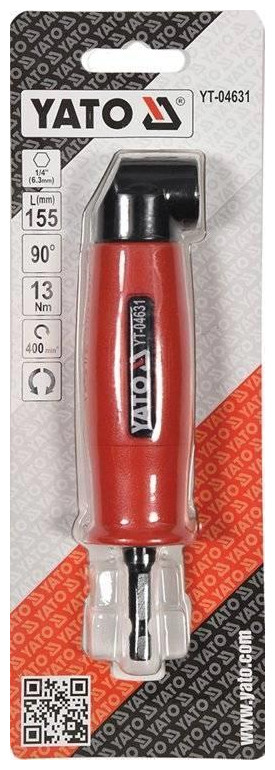 Adapter kątowy z przekładnią marki YATO YT-04631 niezastąpiony podczas pracy w trudno dostępnych miejscach. Wykonany ze stali węglowej, korpus pokryty tworzywem sztucznym. Maksymalny moment obrotowy: 13 Nm • maksymalne obroty: 400 obr./min. Uchwyt magnetyczny HEX, kąt nachylenia: 90°, długość: 155 mm.Parametry Napęd: HEX Długość [mm]: 155