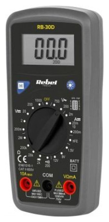 Miernik uniwersalny Rebel Tools RB-30D Rebel Tools to przede wszystkim urządzenia, które mają na celu wspomóc majsterkowiczów, którzy drobne prace remontowe chcą wykonywać samodzielnie. Mając na uwadze, że dobre elektronarzędzia to nie wszystko, seria ta została rozszerzona o szereg urządzeń pomiarowych. Wśród nich znalazły się mierniki uniwersalne i cęgowe, których funkcje umożliwiają mierzenie różnych wartości fizycznych, w tym napięcia i natężenia prądu stałego i zmiennego, co umożliwi np. wykrycie usterki w instalacji elektrycznej. Co więcej, w zależności od modelu, multimetry Rebel Tools pozwalają na pomiar temperatury przedmiotu, sprawdzenie ciągłości obwodu czy przetestowanie diod i tranzystorów hFE. Nie potrzebujesz wielofunkcyjnego urządzenia? Wybierz jeden z dwóch modeli wskaźników napięcia, które umożliwiają pomiar napięcia AC/DC. Remonty często wymagają ingerencji w tynk. Dlatego w serii Rebel Tools znalazł się także detektor 3w1 do wykrywania metali, napięcia oraz drewna. Dzięki temu urządzeniu dowiesz się, w którym miejscu możesz bezpiecznie wywiercić otwór w ścianie by zamontować obraz czy półkę, nie martwiąc się o uszkodzenie instalacji elektrycznej. To jeszcze nie koniec urządzeń pomiarowych z serii Rebel Tools! Do dyspozycji masz także tester linii telefonicznych, informujący m.in. o zwarciach i przerwach przewodów czy o ich zamienionej kolejności. Potrzebujesz szerszej funkcjonalności? Wybierz szukasz par przewodów, który oprócz testowania kabli telefonicznych, umożliwia także testowanie kabli sieciowych, przeprowadzenie testu ciągłości oraz lokalizowanie poszukiwanych przewodów. Dzięki Rebel Tools możesz także zapomnieć o klasycznej miarce – w serii znalazł się bowiem laserowy miernik dystansu z zasięgiem 18 metrów. Na uwagę zasługują dodatkowe funkcje tego dalmierza, m.in. poziomica czy pomiar pola powierzchni lub objętości. Serię urządzeń pomiarowych Rebel Tools zamykają testery baterii, które umożliwią sprawdzenie beterii: 9 V, AAA, AA, C, D oraz guzikowych. ZAKRESY POMIAROWE Napięcie DC: 200 mV, 2 V, 20 V, 200 V, 1000 V ±(1%+5) Napięcie AC: 200 V, 750 V ±(2%+10) Natężenie prądu DC: 2 mA, 20 mA, 200 mA, 10 A ±(2%+10) Rezystancja: 200 Ohm, 2 kOhm, 20 kOhm, 200 kOhm, 2 MOhm ±(1%+4) Test baterii: 1,5 V, 9 V, 12 V Test diod Test tranzystorów hFE Test ciągłości obwodu CECHY OGÓLNE Podświetlany wyświetlacz Ręczna zmiana zakresów pomiarowych Rozkładana podstawka Zamrożenie ostatniego wskazania Wskaźnik niskiego poziomu baterii Polaryzacja: automatyczna Częstotliwość próbkowania: 2 razy na sekundę Maksymalny odczyt: 1999 Rozmiar wyświetlacza: 45 x 21 mm Temperatura pracy: 0°C ~ 40° przy wilgotności