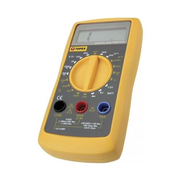 Ο γενικός ηλεκτρονικός μετρητής TOPEX (αρ. αναφοράς 94W104) χρησιμοποιείται για τη μέτρηση τάσης εναλλασσόμενου και συνεχούς ρεύματος, τιμή συνεχούς ρεύματος, ηλεκτρική αντίσταση και μέτρηση διόδου. Σώμα από πλαστικό υψηλής ποιότητας. Η μεγάλη οθόνη LCD διευκολύνει την ανάγνωση της μέτρησης. Η συμμόρφωση με τα ευρωπαϊκά πρότυπα ασφαλείας διασφαλίζεται από το πιστοποιητικό CE. Η μάρκα TOPEX απευθύνεται σε λάτρεις των DIY.{Βασικές λειτουργίες} Μέτρηση αντίστασης. {Βασικές λειτουργίες} Μέτρηση τάσης DC. {Βασικές λειτουργίες} Μέτρηση τάσης AC. {Βασικές λειτουργίες} Δοκιμή διόδου. {Type} Πολύμετρα